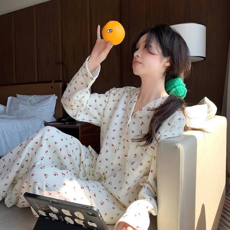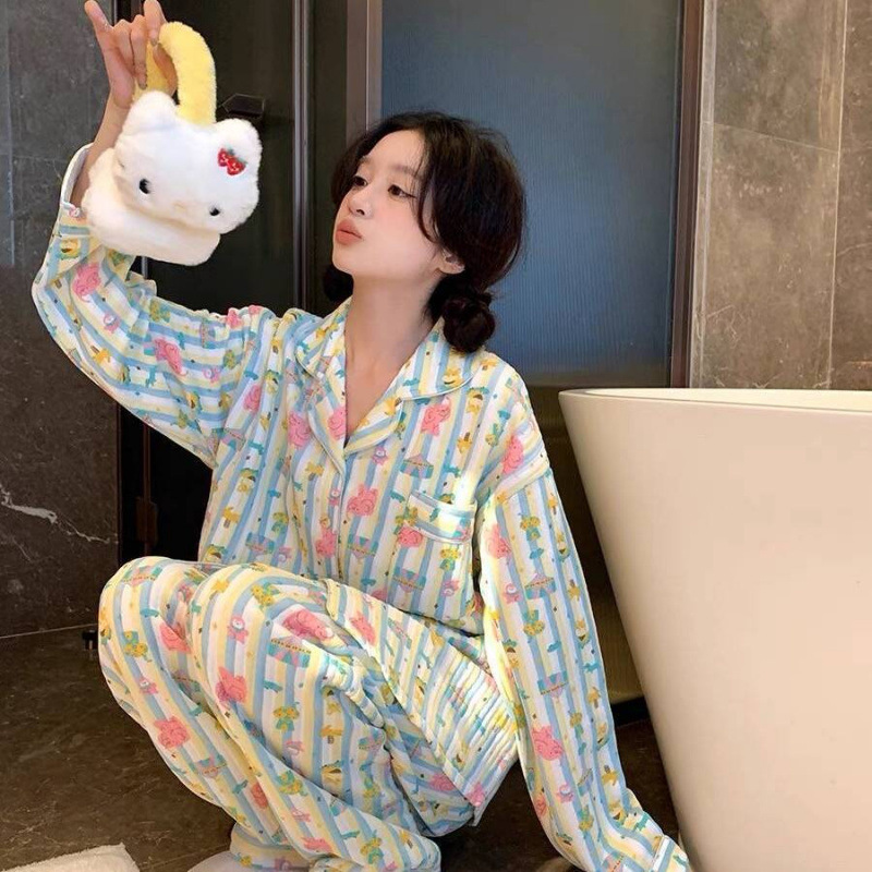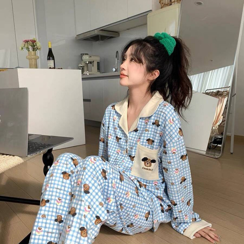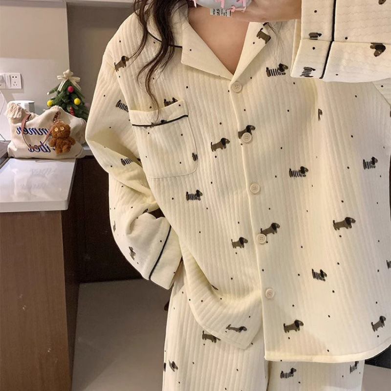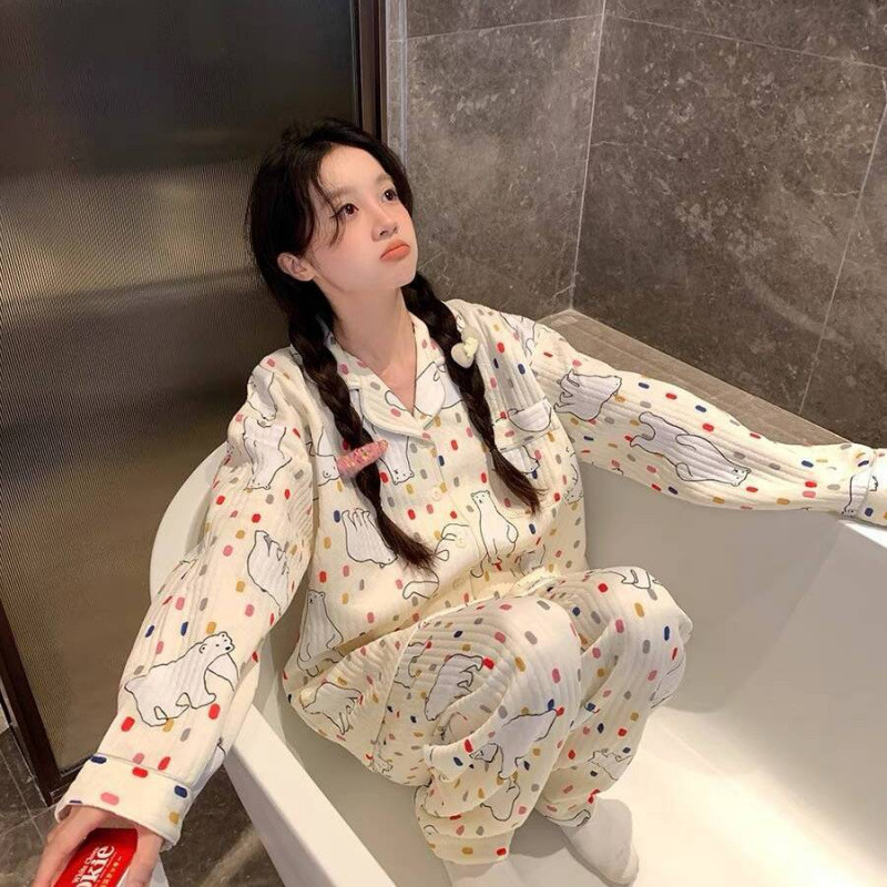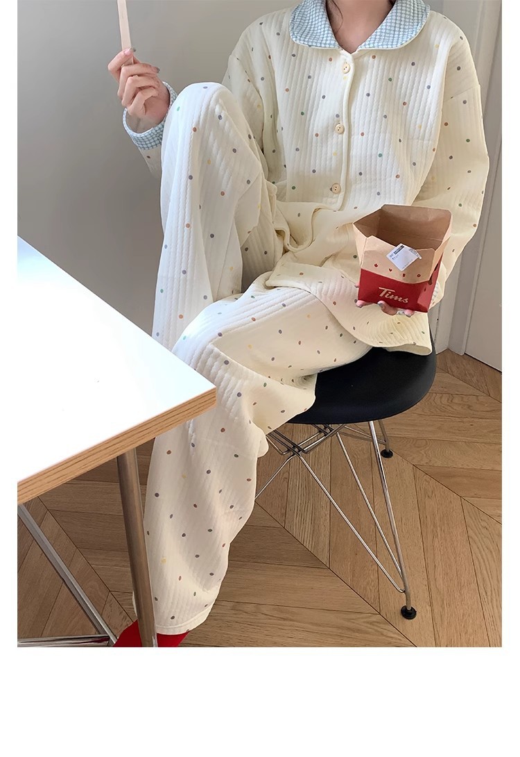 2024 새로운 가을과 겨울 면화 따뜻한 잠옷 여성용 달콤한 색 웨이브 도트 긴 소매 세트 두꺼운 따뜻한 집 옷스토어 가기