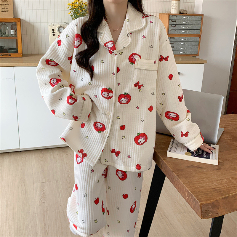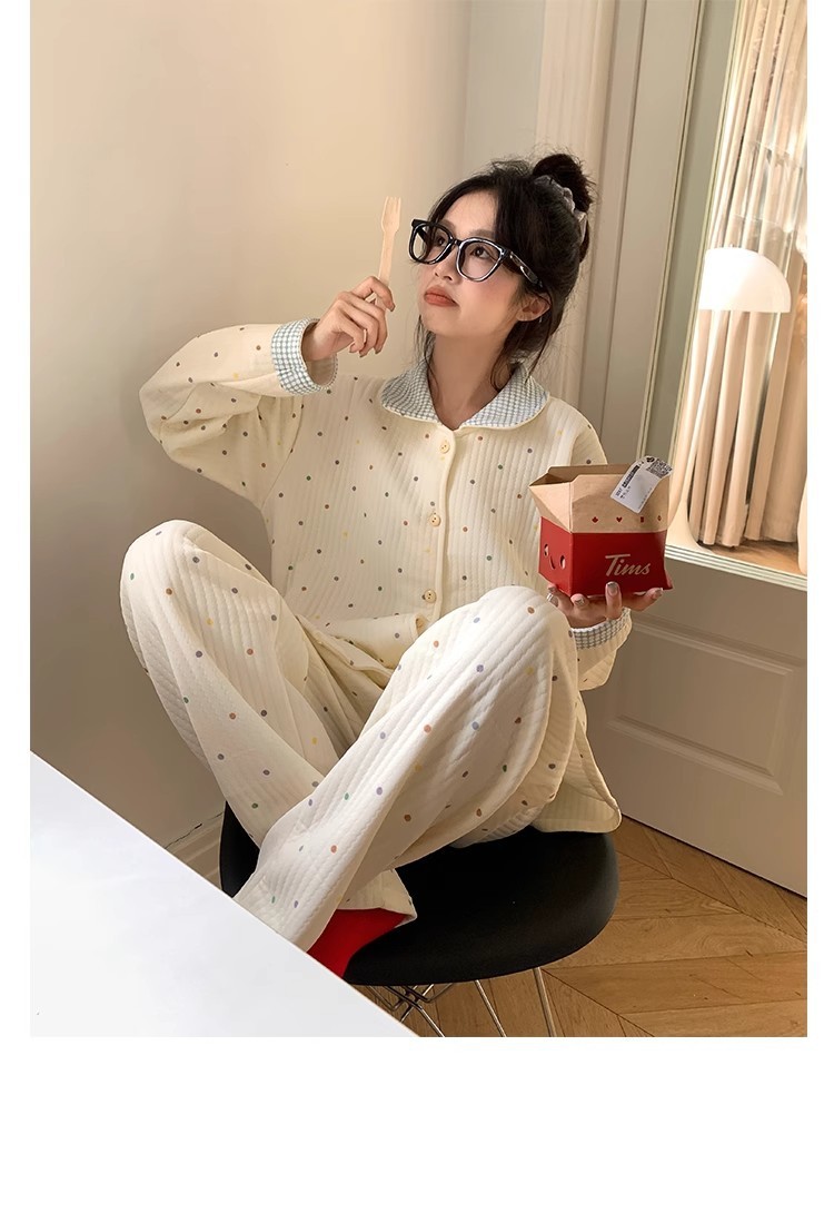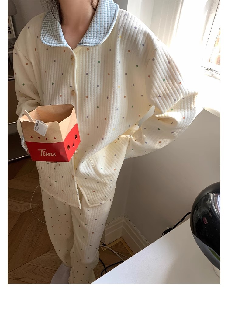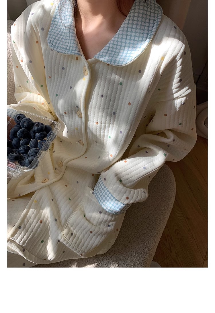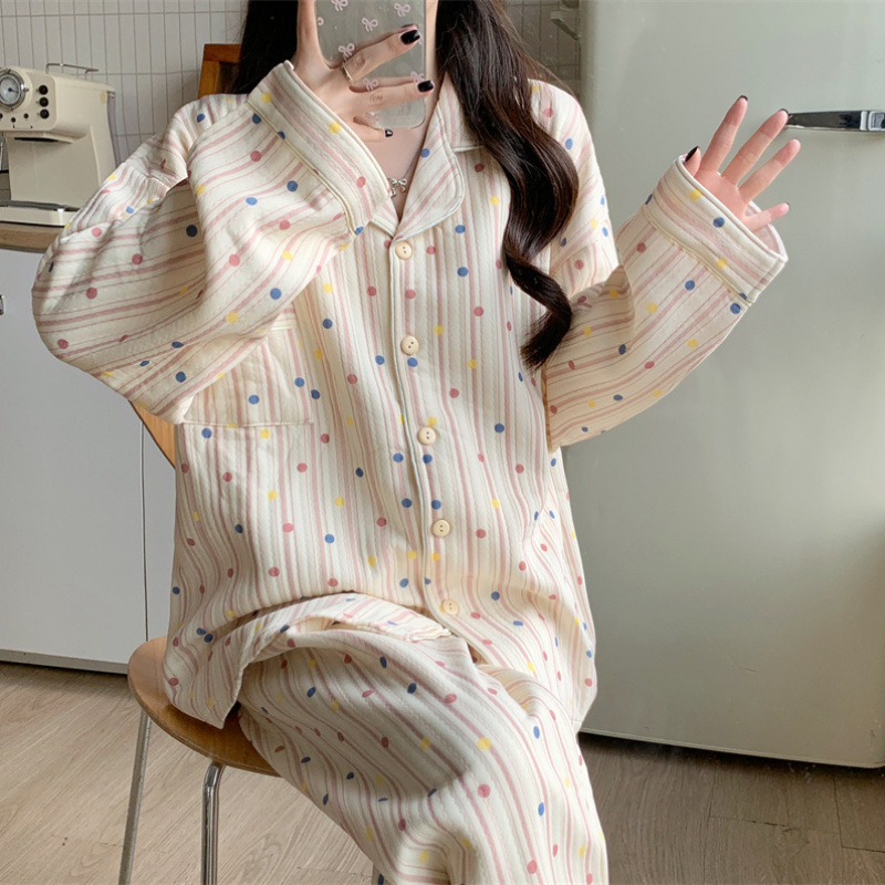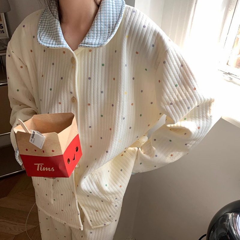 2024 새로운 가을과 겨울 면화 따뜻한 잠옷 여성용 달콤한 색 웨이브 도트 긴 소매 세트 두꺼운 따뜻한 집 옷