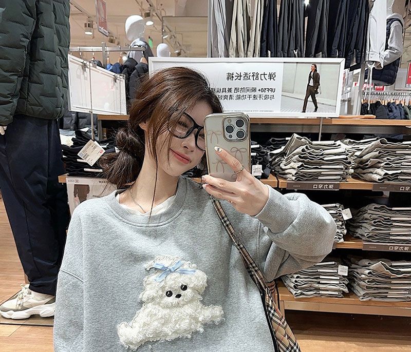 3 차원 봉제 강아지 크루 넥 풀오버 스웨터 여성의 가을과 겨울 회색 두꺼운 느슨한 캐주얼 긴 소매 탑