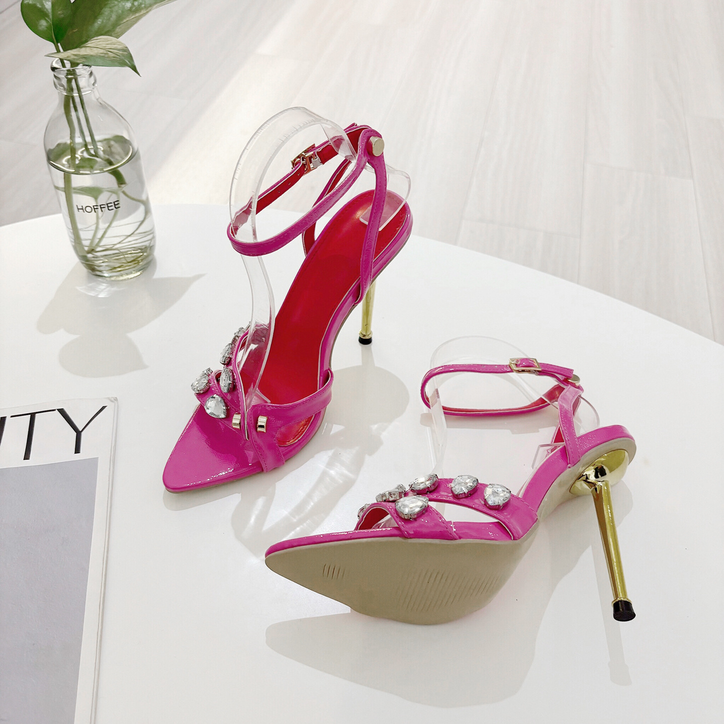 샌들 여자 2025 새로운 유럽 및 미국 여성 신발 섹시한 크로스 스트랩 라인스톤 오픈 발가락 하이힐 샌들 여자 여름스토어 가기