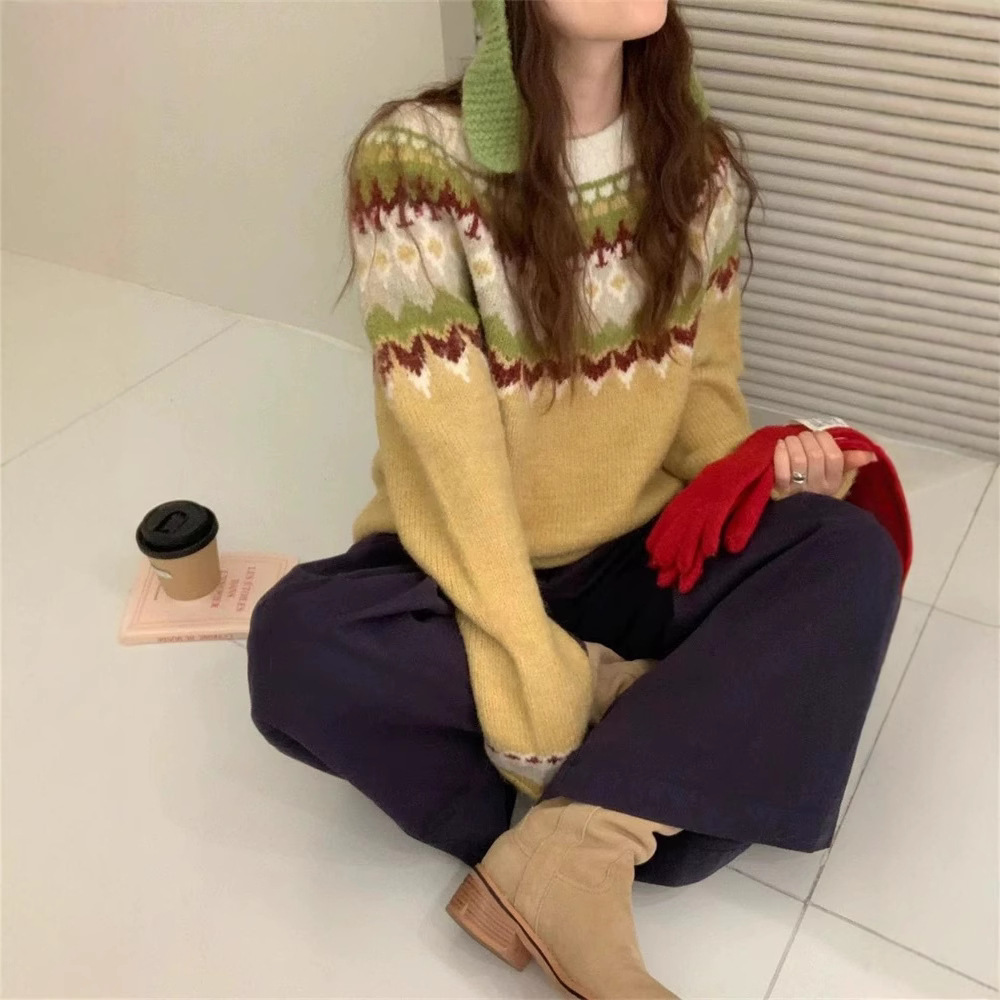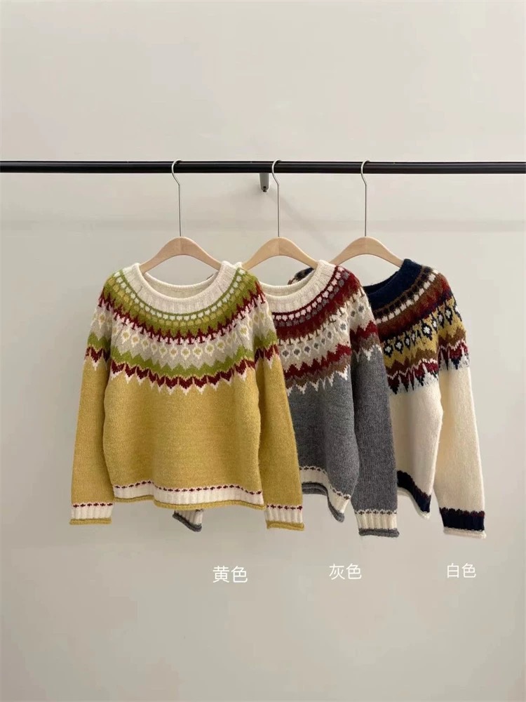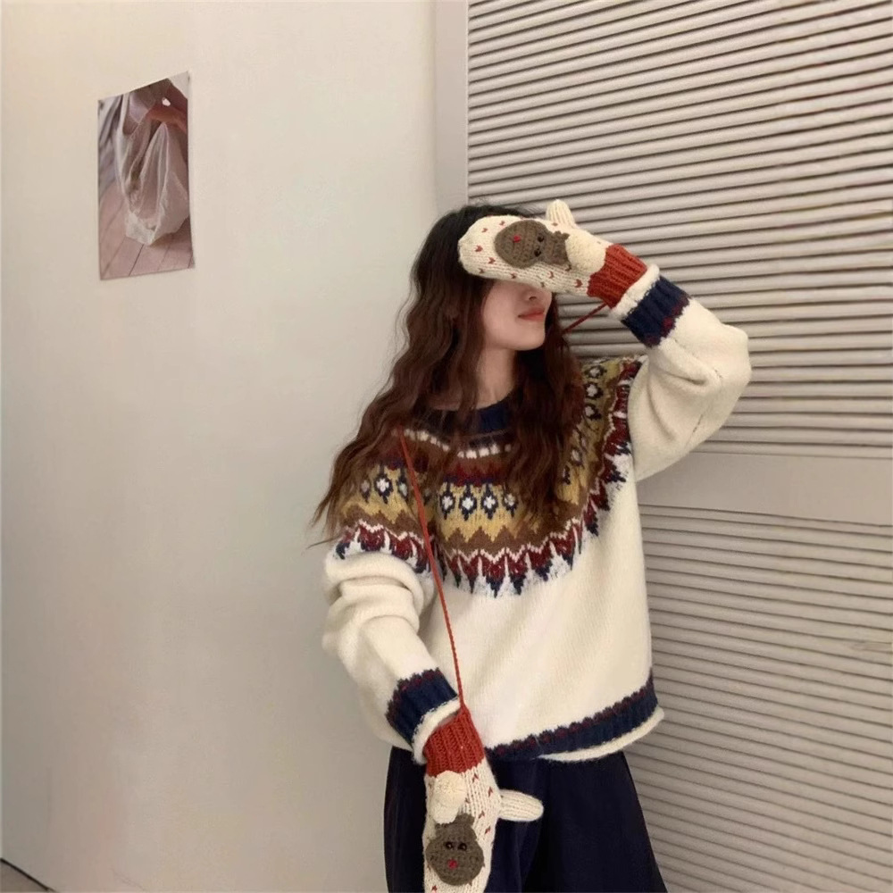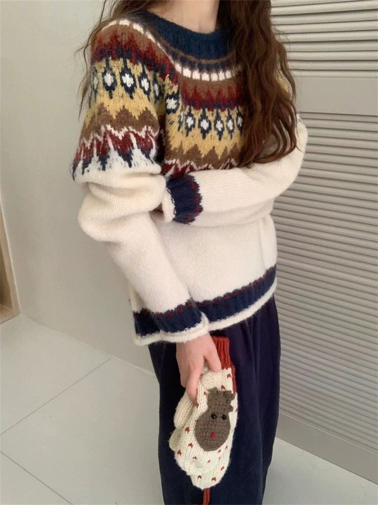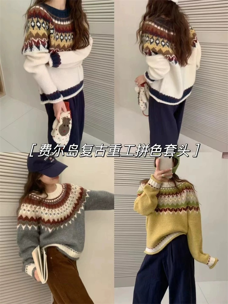 한국식 링지 페어랜드 자카드 풀오버 스웨터 2024 가을과 겨울 새로운 두꺼운 크리스마스 스웨터 소프트 왁스 레트로스토어 가기