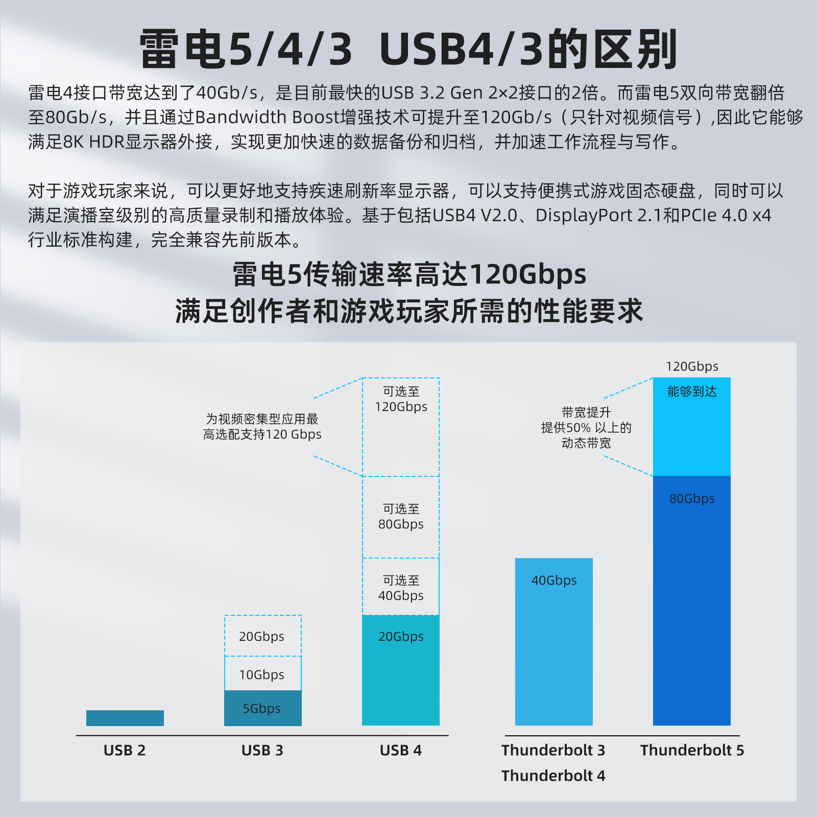 在默认模式下,雷电 5 允许每道数据流的最大传输速率为 80Gbps,其中 80Gbps 用于数据传输,80Gbps 用于接收数据。当开启带宽 Boost 功能后,它会根据数据传输的实时状态,自动将上行带宽压缩至 40Gbps,并将下行带宽拓宽到 120Gbps。也就是说,对于有高带宽需求的下行数据传输,如连接高分辨率显示器或进行大文件下载等操作时,带宽 Boost 功能能让传输速度提升 40Gbps,相比雷电 4 提升了两倍,极大地提高了数据传输效率,满足了专业用户对高性能连接的需求。