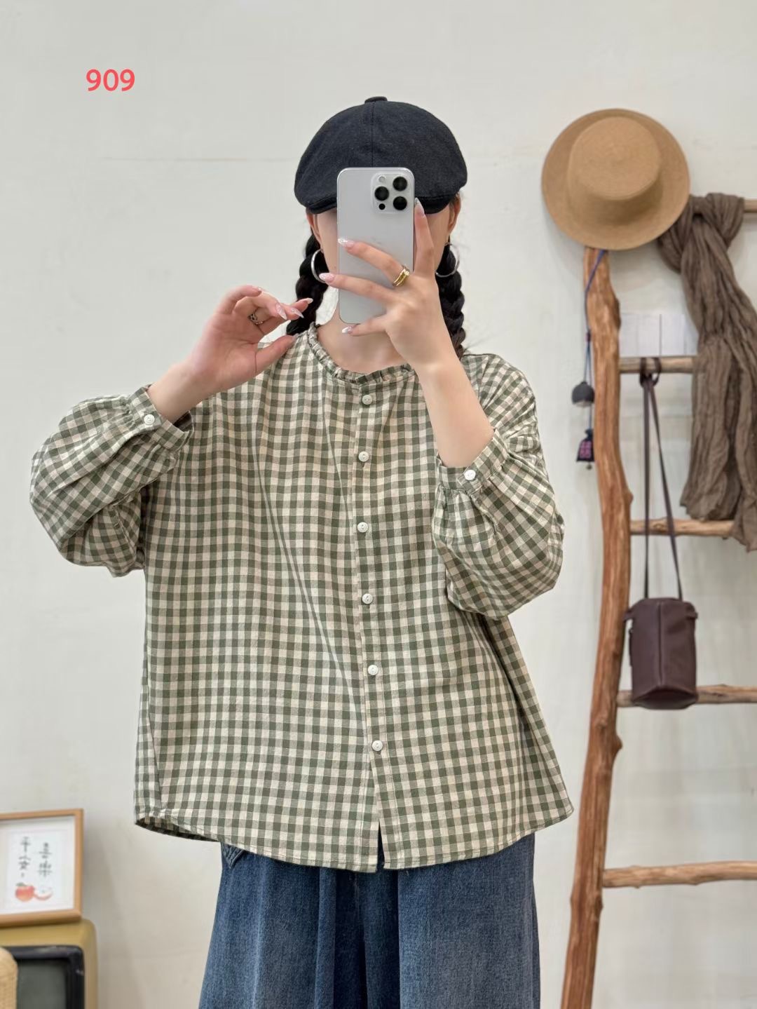 격자 무늬 싱글 브레스트 셔츠 새로운 스탠드 칼라 나무 귀 긴 소매 복고풍 느슨한 카디건 최고의 여성 도매스토어 가기