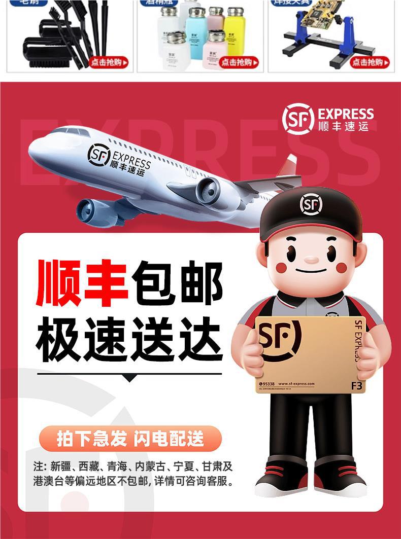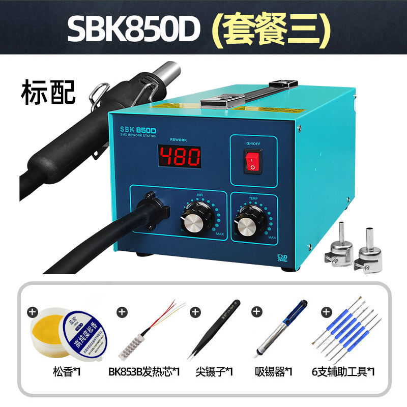 • SBK850D 손잡이 모델 3개 세트(표준 구성 + 로진 + 가열 코어 + 뾰족한 핀셋 + 납땜 흡입 장치 + 보조 도구)