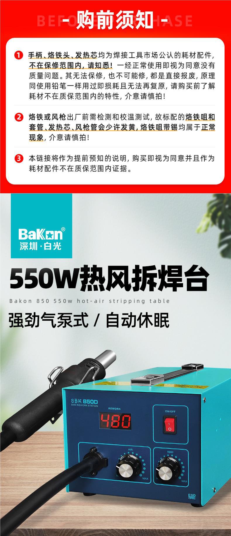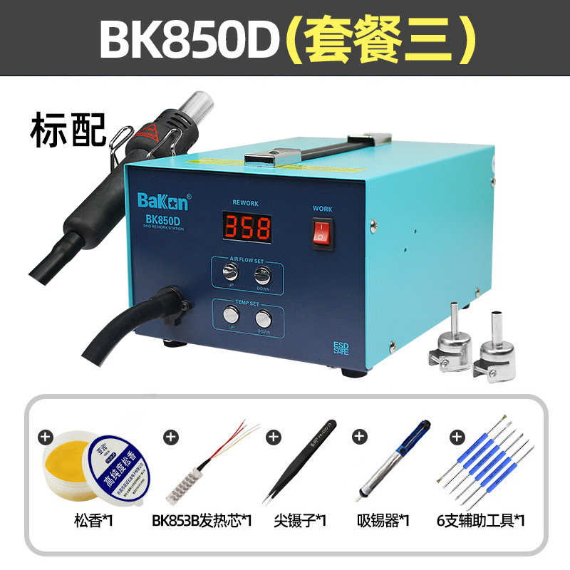 • BK850D 버튼 모델 3개 세트(표준 구성 + 로진 + 가열 코어 + 뾰족한 핀셋 + 납땜 흡입 장치 + 보조 도구)