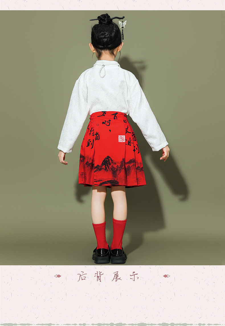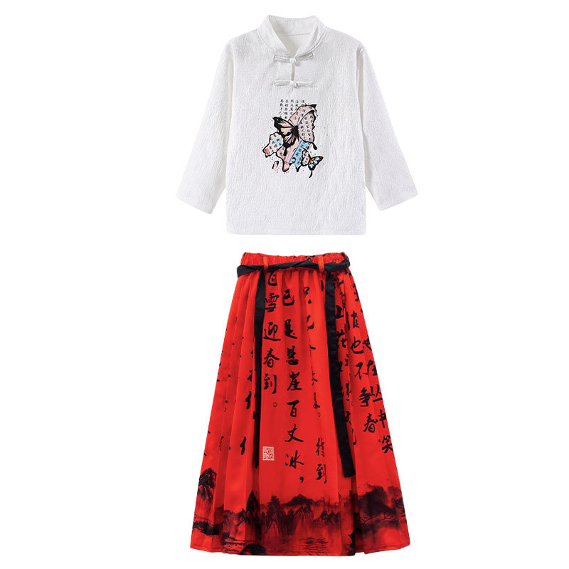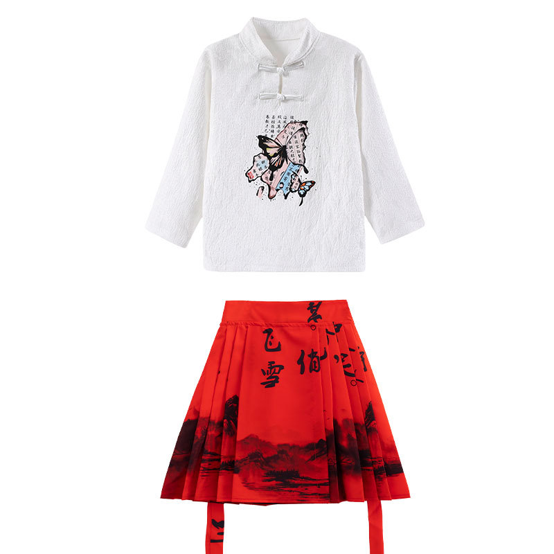 • 긴 소매: A601 흰색 중국 스타일 나비 탑 + B286 빨간색 말 얼굴 스커트