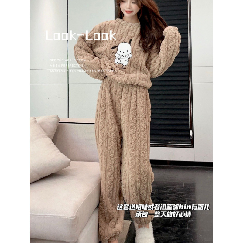 하파 개 자카드 코튼 벨벳 세트 2023 새로운 겨울 두꺼운 따뜻한 만화 의상 여성 홈 옷스토어 가기