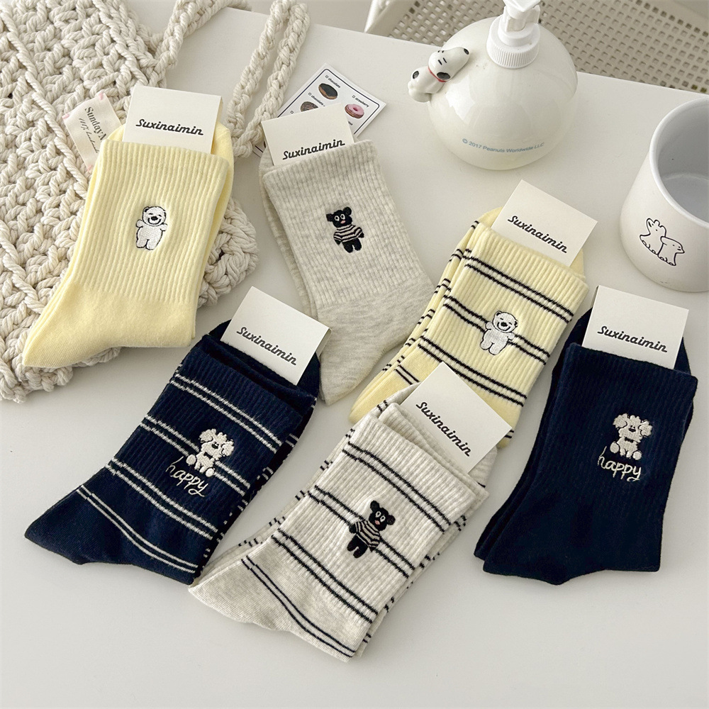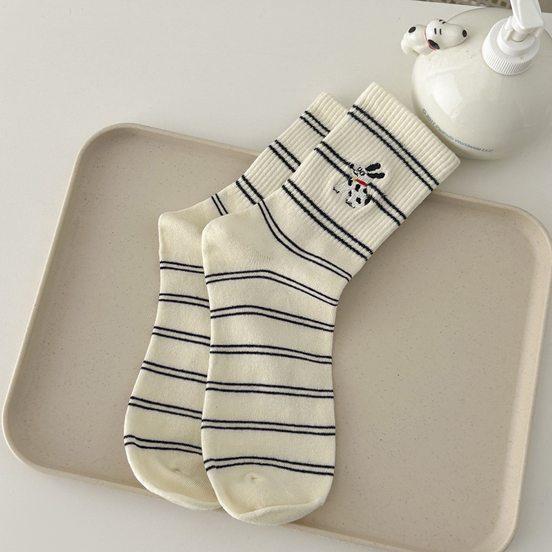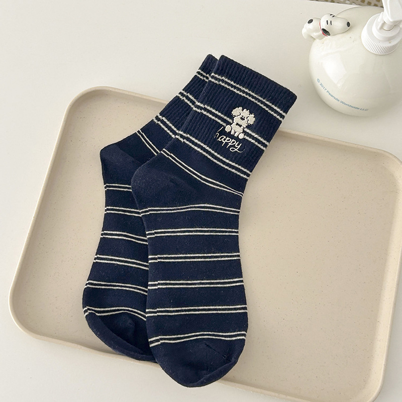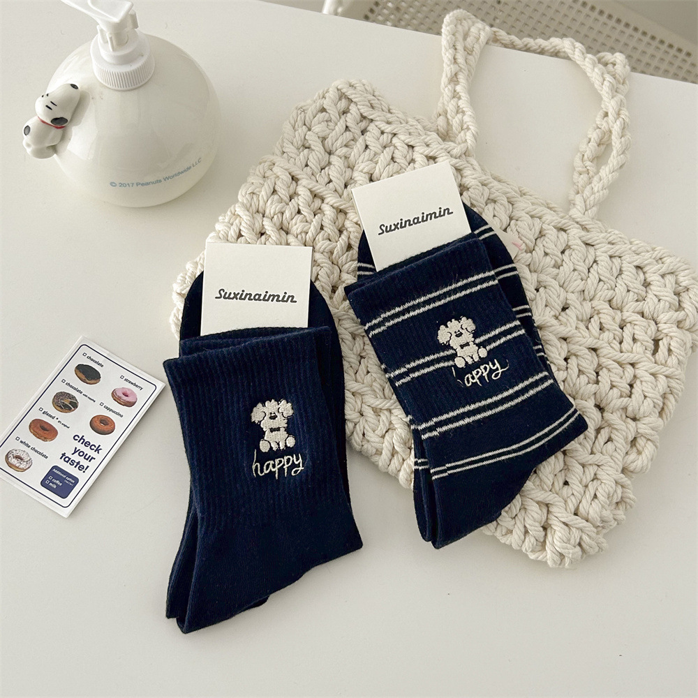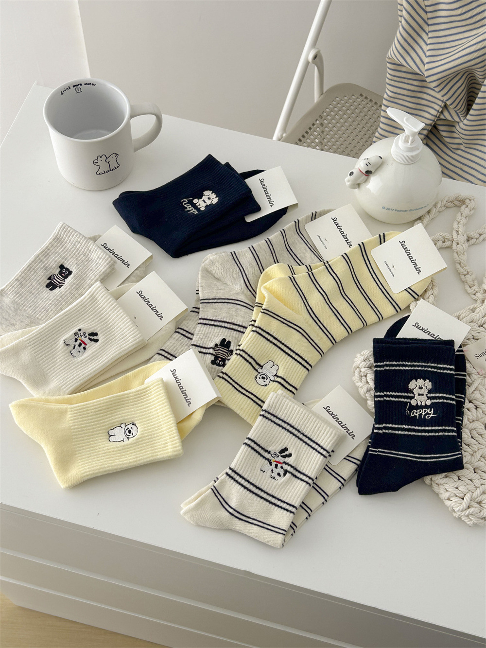 여성용 가을 신상 스트라이프 자수 만화 강아지 중목 양말 인스 트렌드 귀여운 일본식 컬리 양말스토어 가기