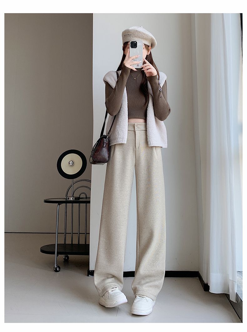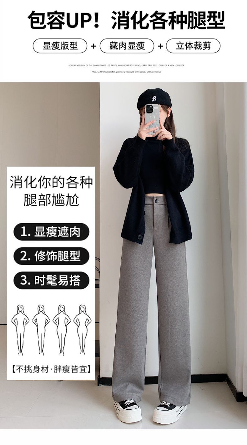 두꺼운 모직 양모 넓은 다리 바지 여자 가을 새로운 스트레이트 느슨한 높은 허리 겨울 올 매치 높은 허리 바지 세트 바지스토어 가기