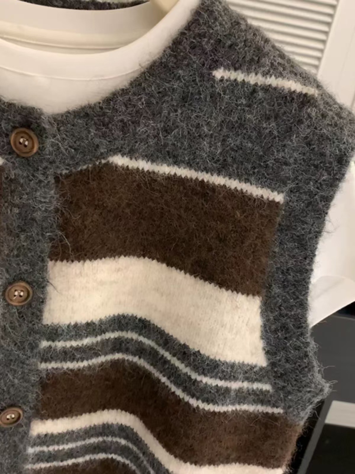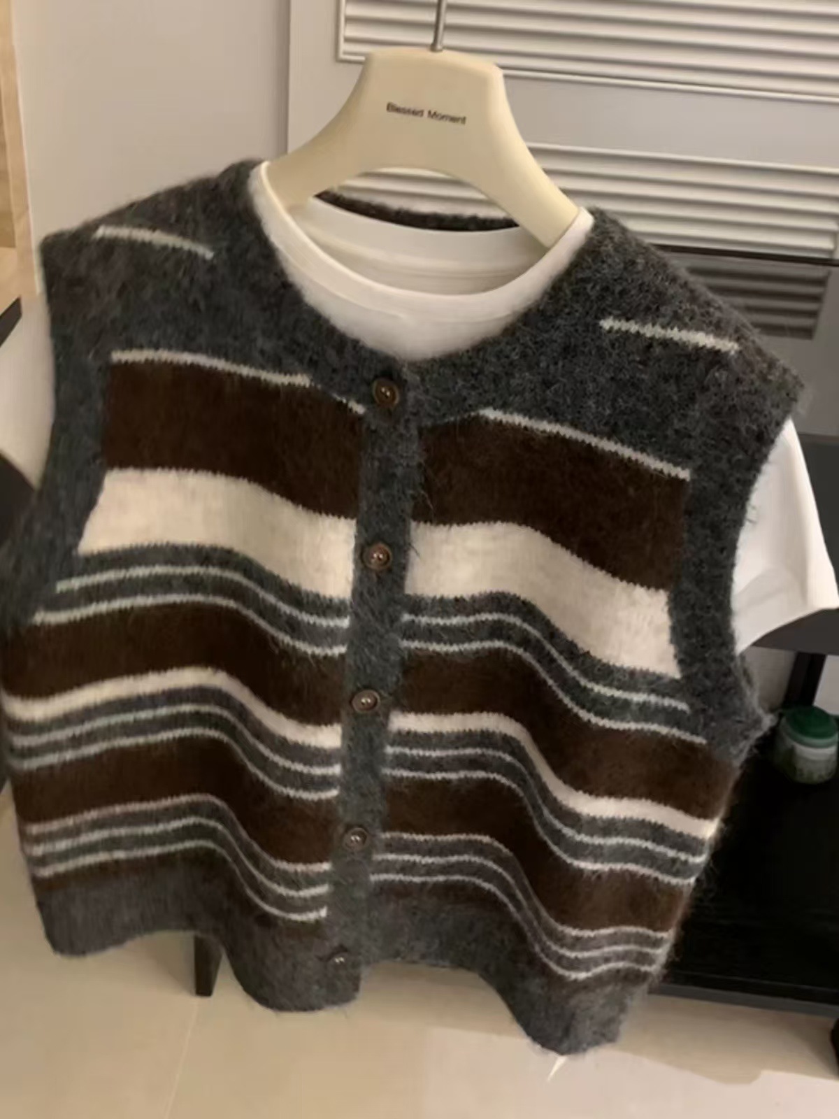 复古条纹慵懒风简约圆领气质针织马甲时尚秋款宽松叠穿坎肩上衣女
