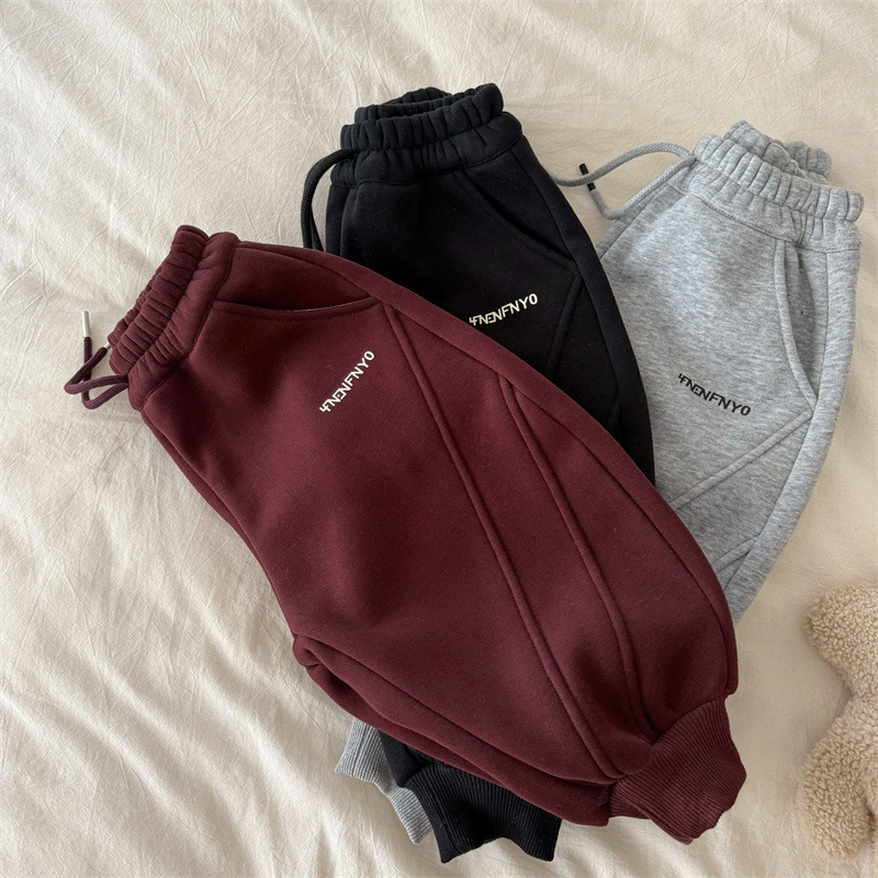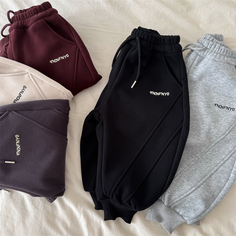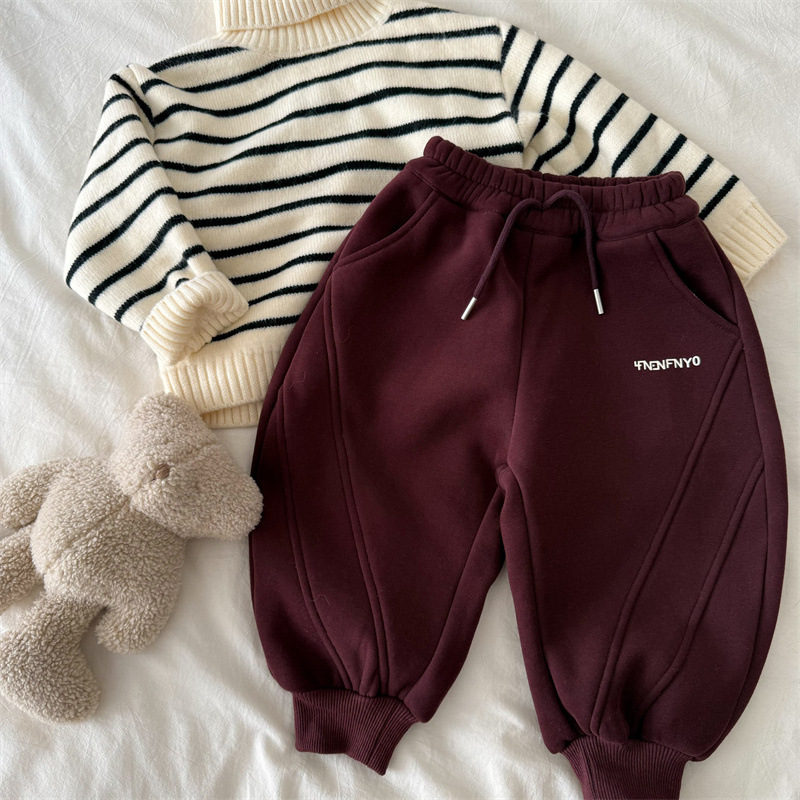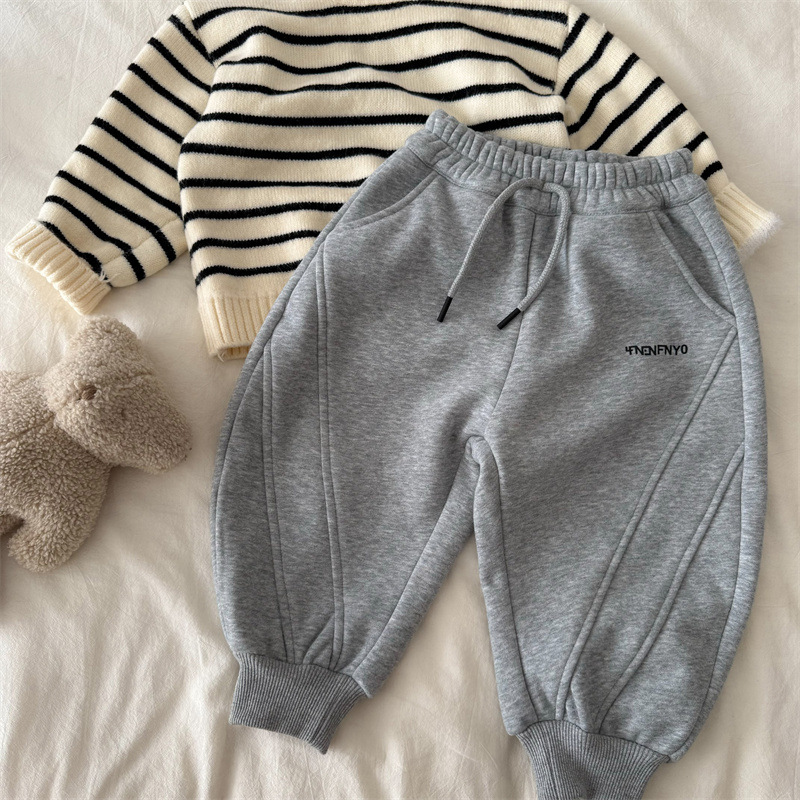 어린이 바지 2024 겨울 새 소년 소녀 편지 단색 기모 캐주얼 바지 아기의 원피스 벨벳 땀 바지