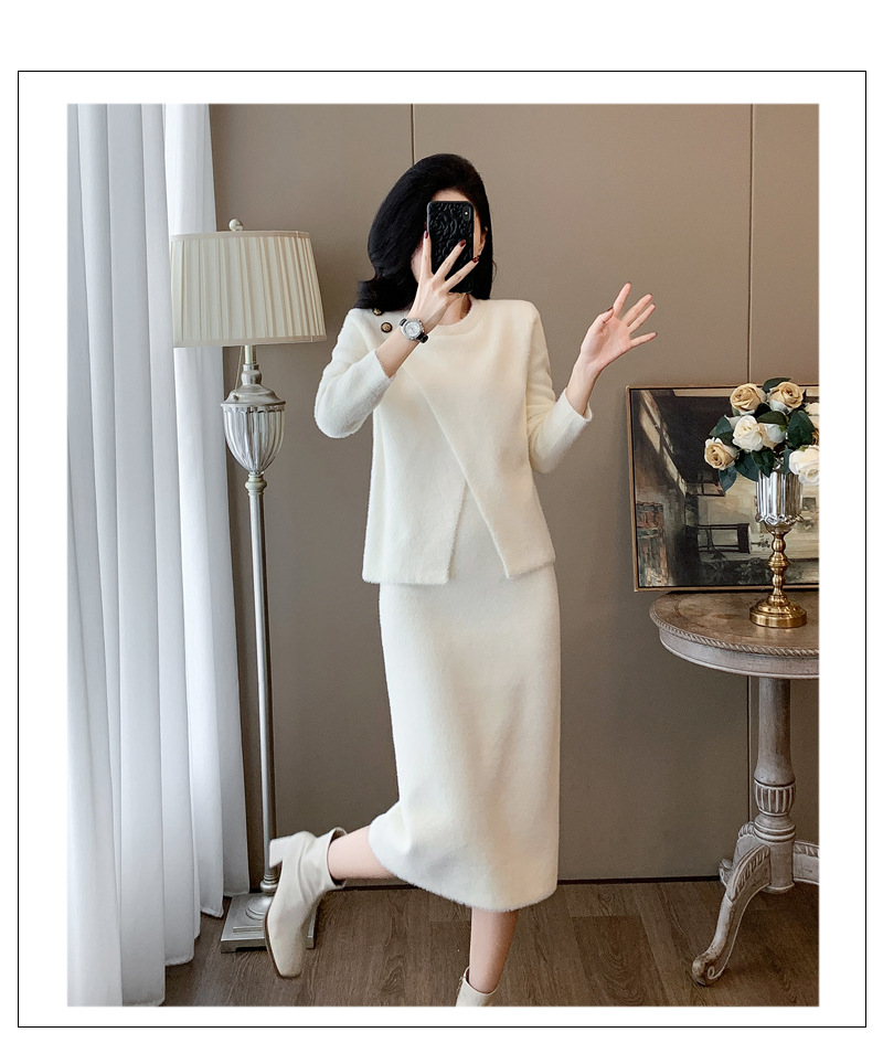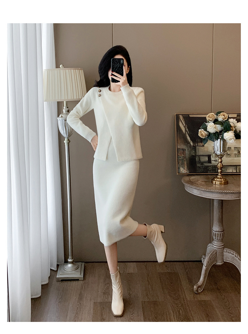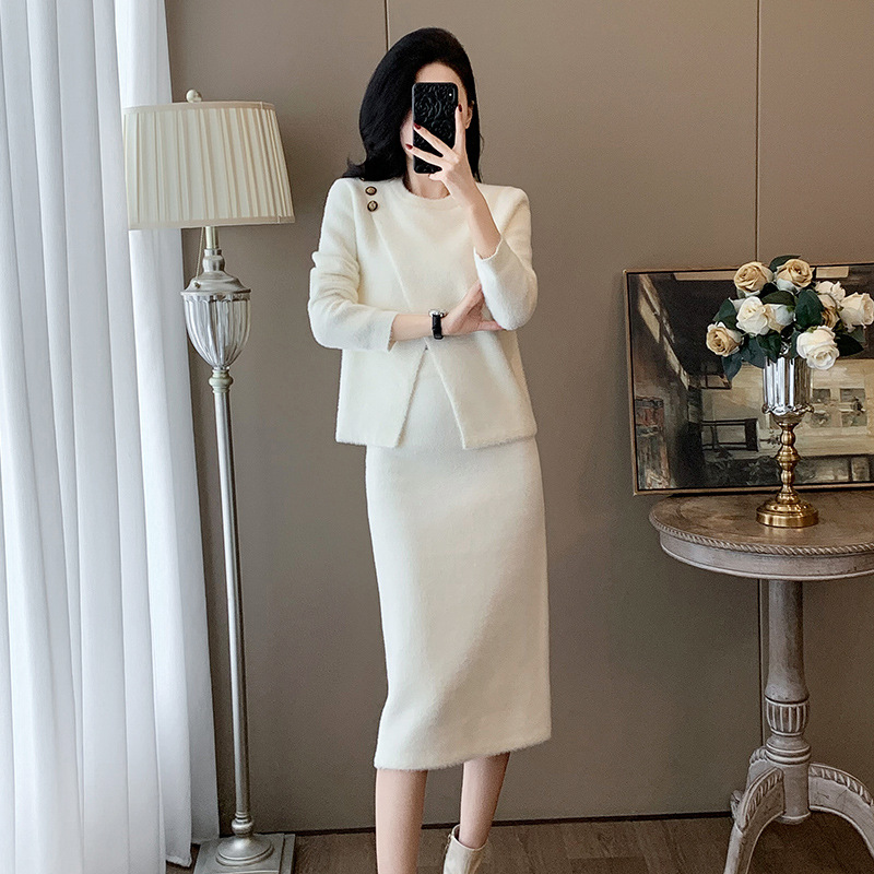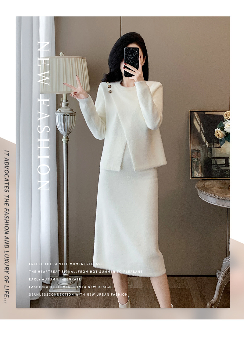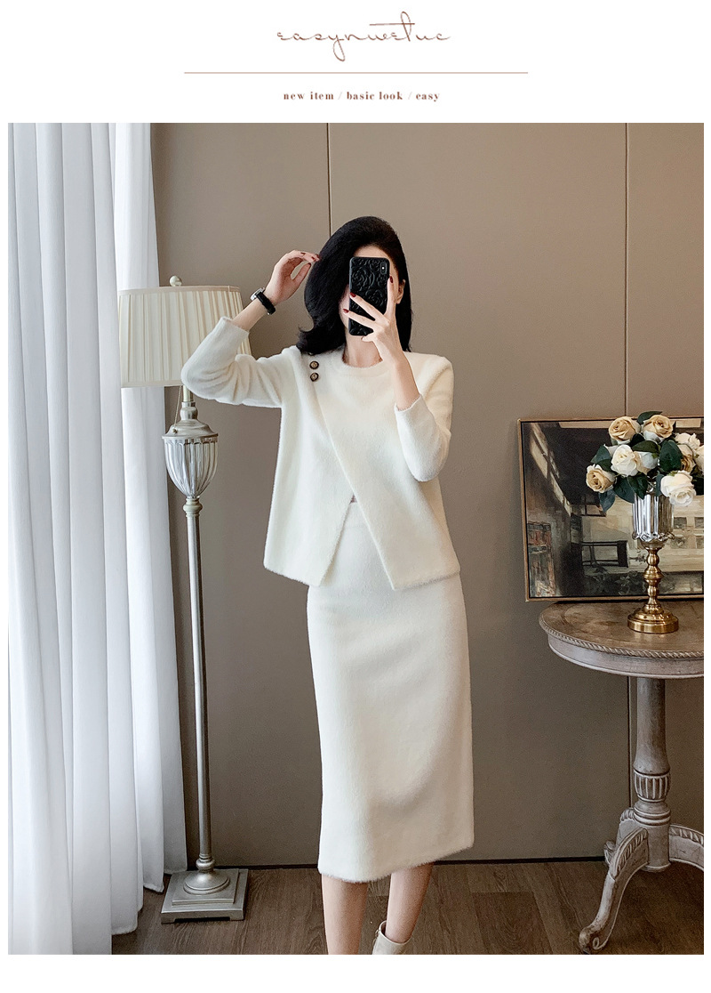 우아한 사교계 샤넬 스타일 패션 캐주얼 세트 여성 가을 모조 밍크 탑 힙합 스커트 니트 투피스 원피스스토어 가기