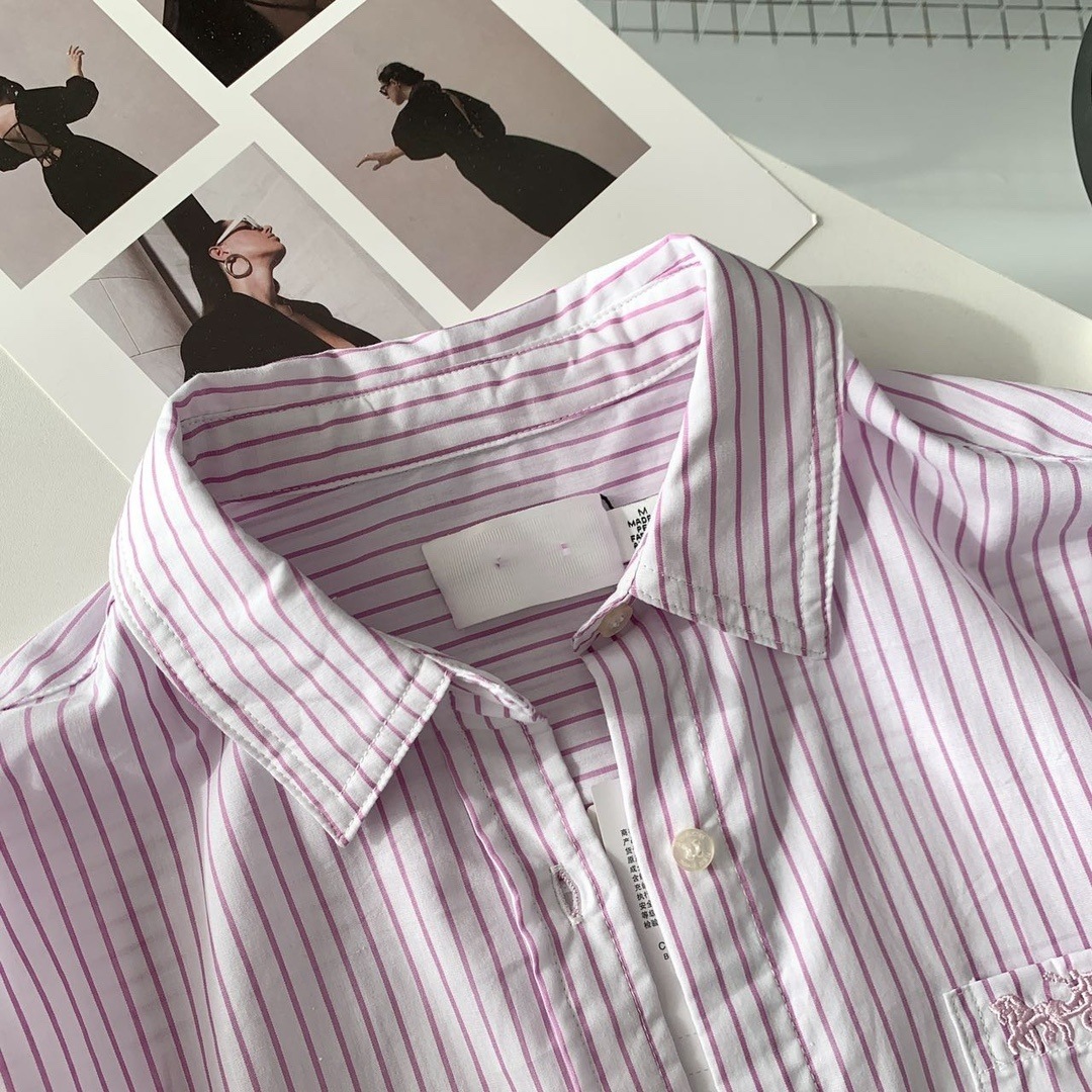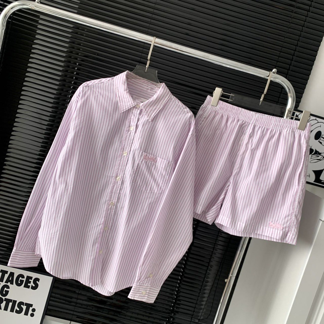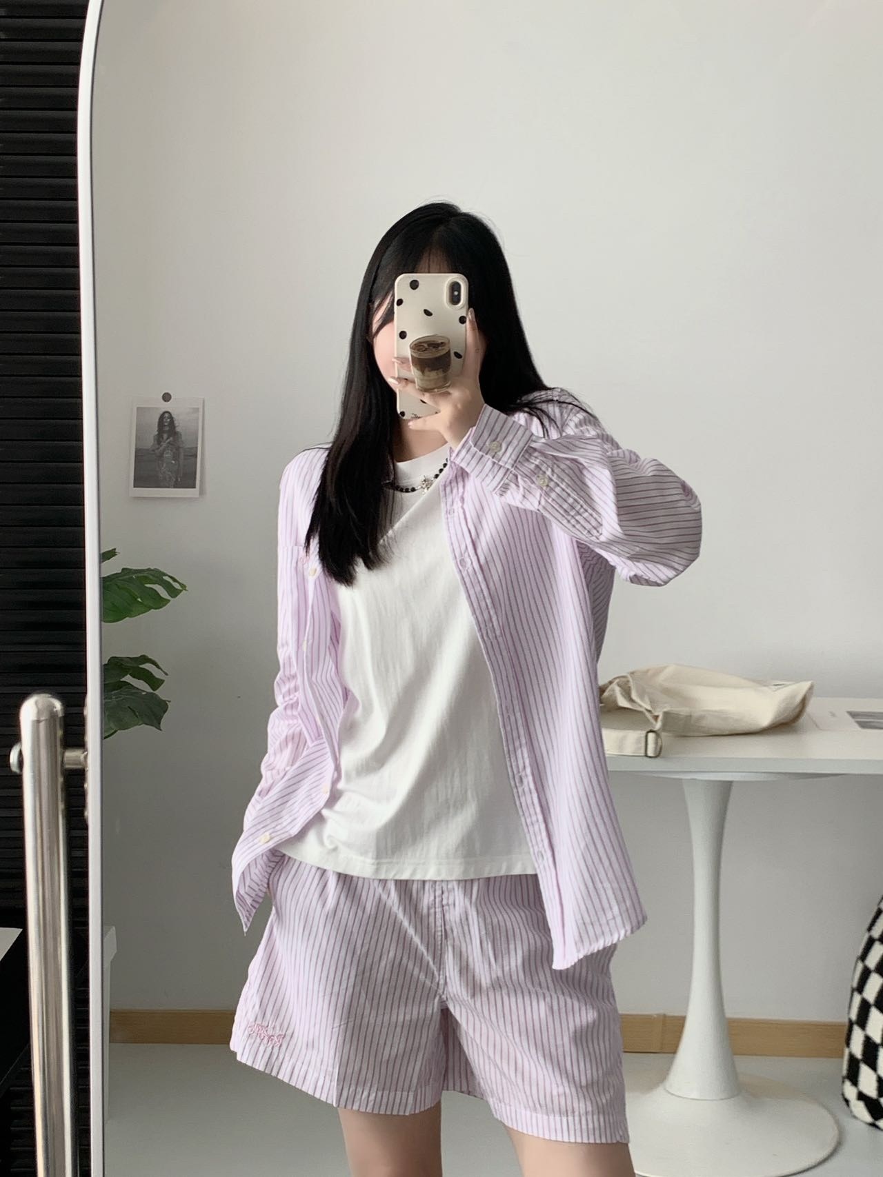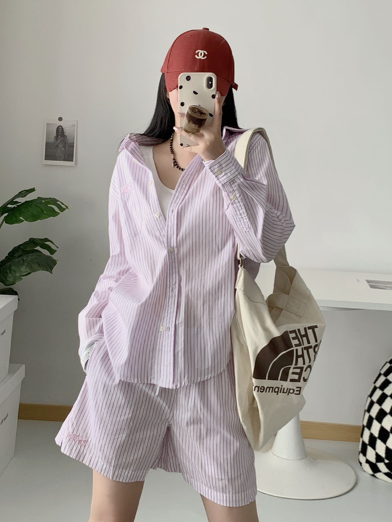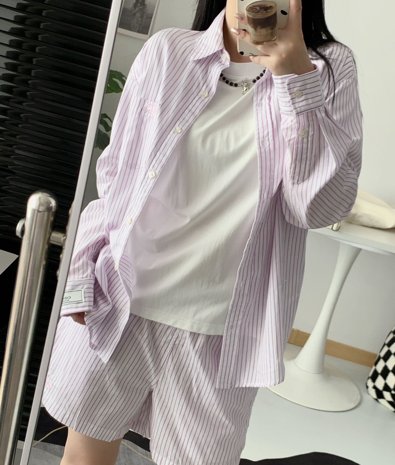1027ch Kojia 봄과 가을 새로운 자수 라벨 핑크 줄무늬 느슨한 슬리밍 올 매치 여자 셔츠 반바지 세트