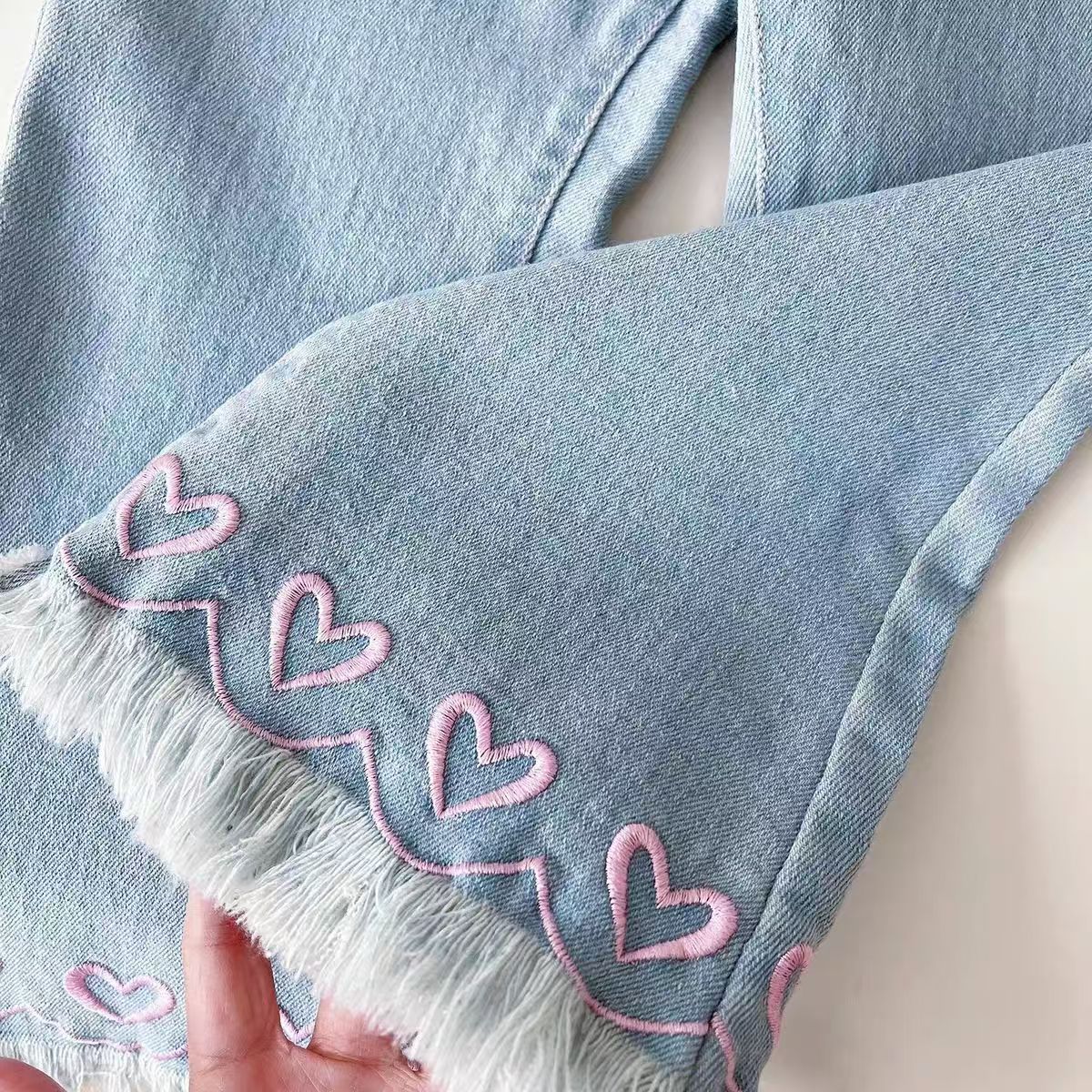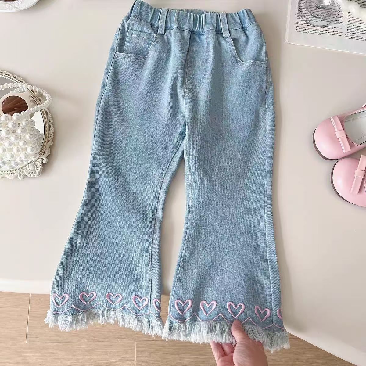 2024 새로운 소녀의 사랑 레이스 청바지 가을 세련된 어린이 유행 아기 소녀 트럼펫 바지스토어 가기