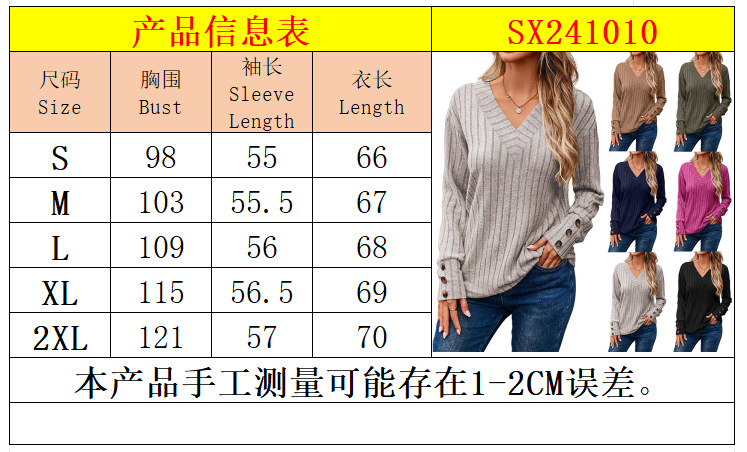 유럽과 미국 국경 여성 2024 가을과 겨울 새로운 아마존 여성의 긴 소매 V 넥 셔츠 단색 버튼 티셔츠스토어 가기