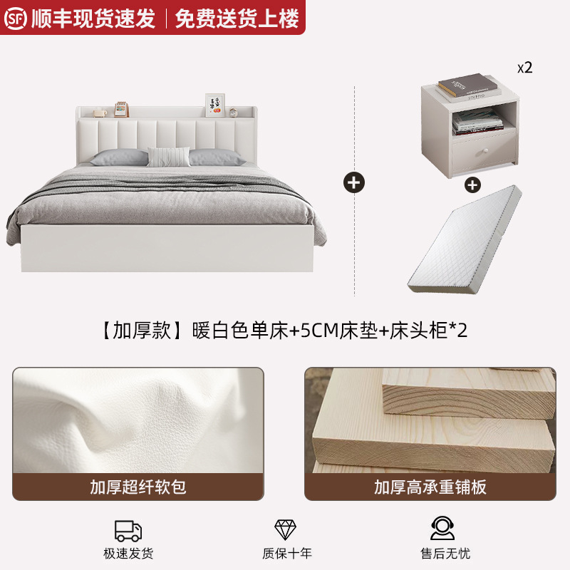 • [두꺼운 모델] 따뜻한 흰색 싱글 침대 + 10cm 매트리스 + 침대 옆 탁자 * 2 [위층 배송]