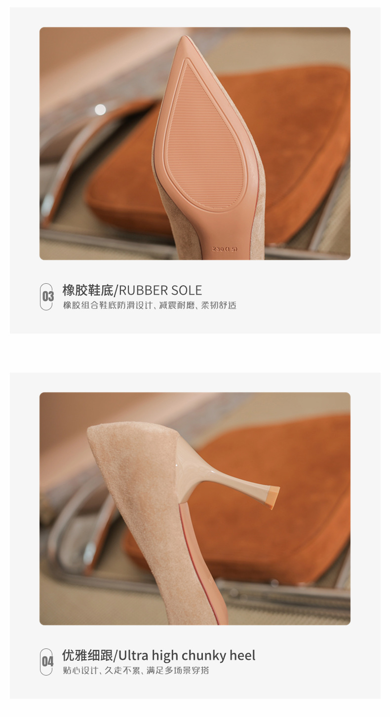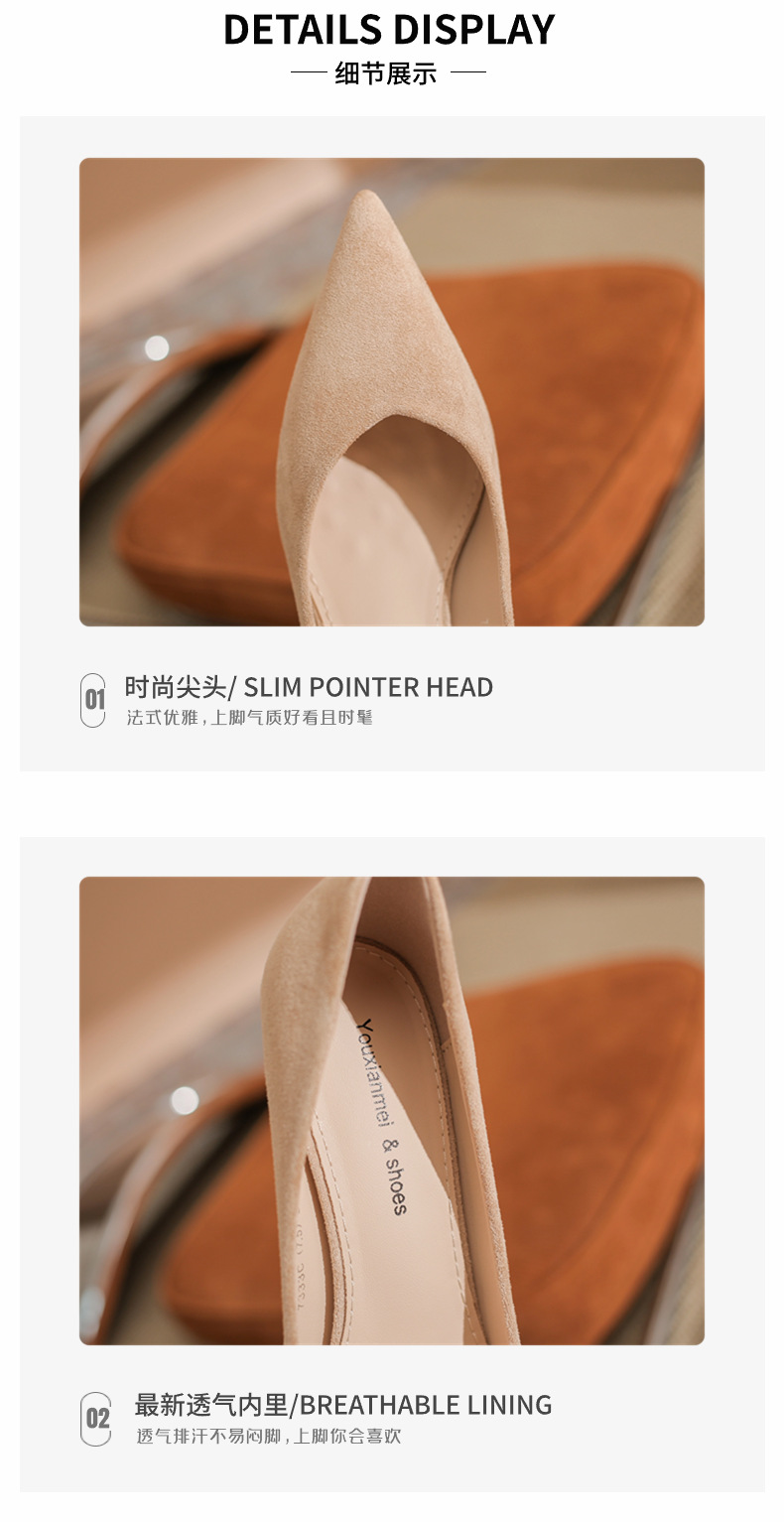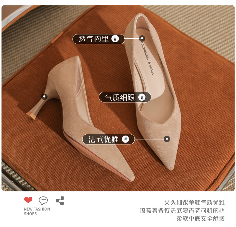 7333C 작은 V-입 스웨이드 스틸레토 힐 여성 신발 전문 신발 통근 프랑스 올 매치 우아한 스퀘어 힐 프리미엄 센스