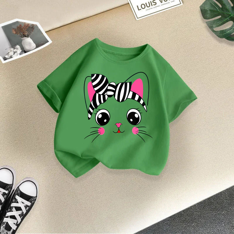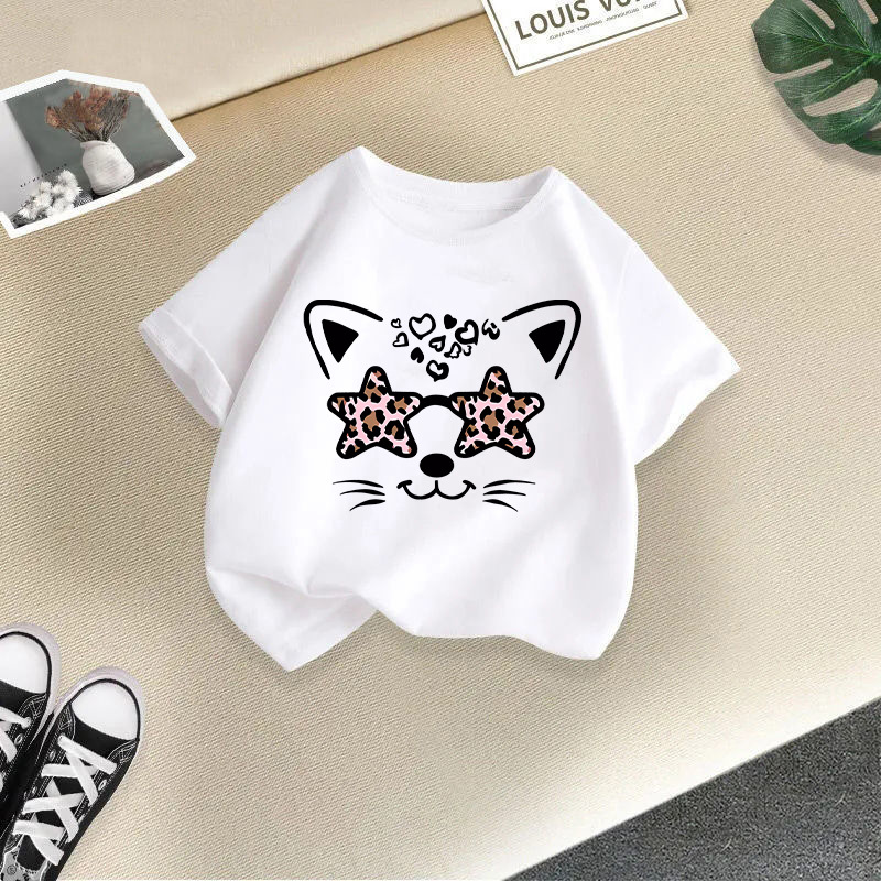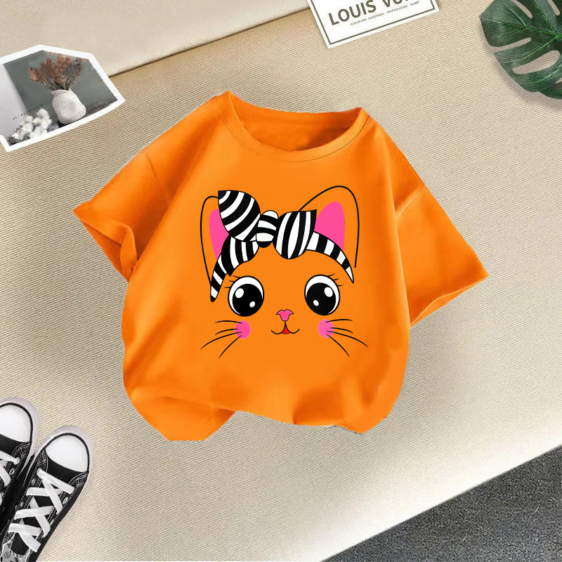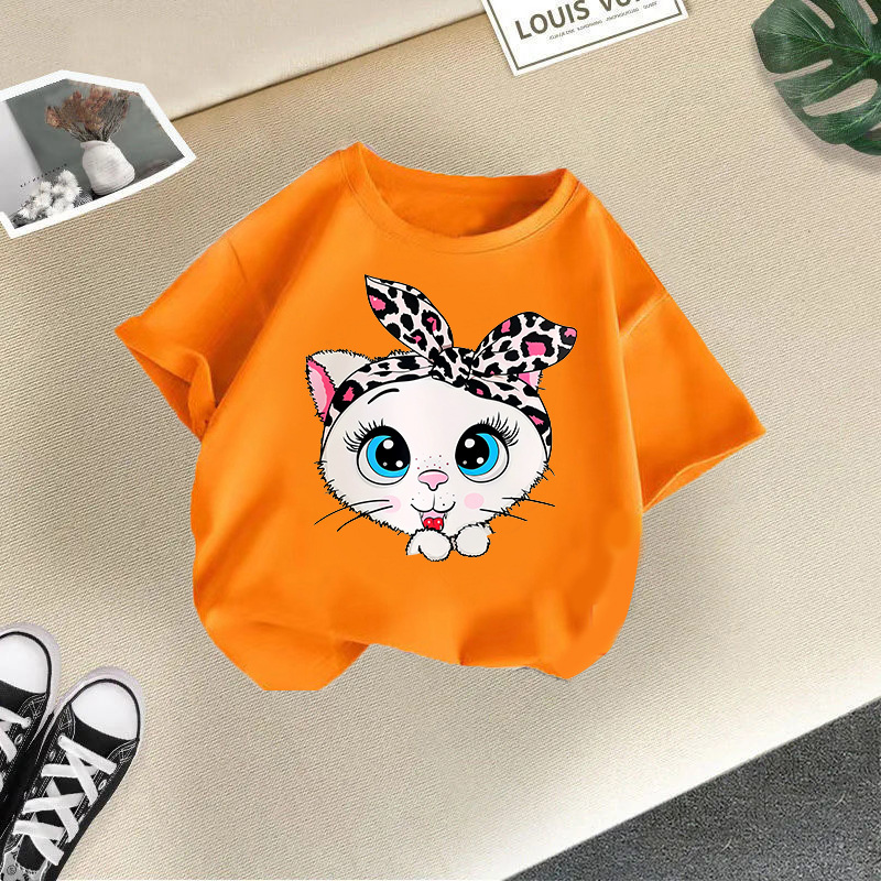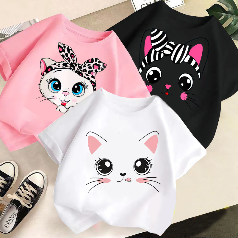2024 새로운 국경 소녀 반팔 어린이 티셔츠 귀여운 고양이 인쇄 올매치 어린이 여름 트렌디 탑스토어 가기