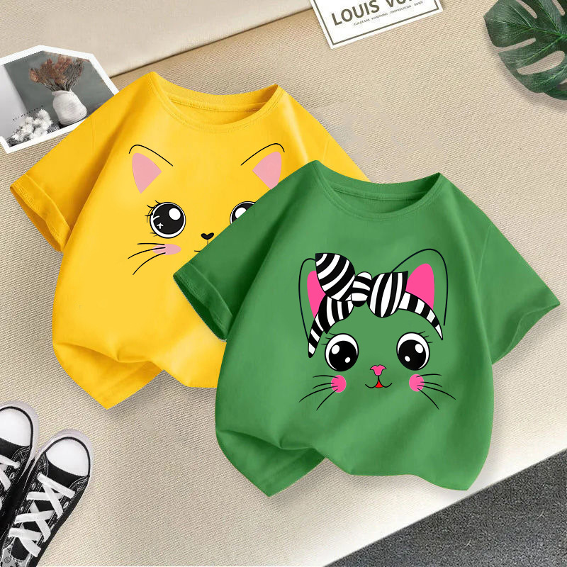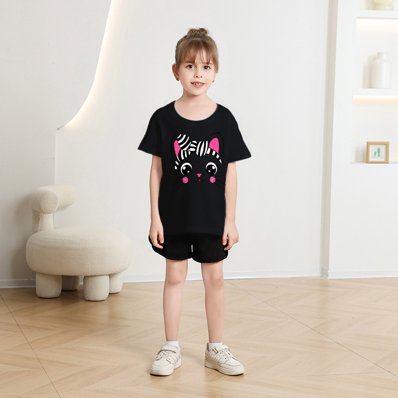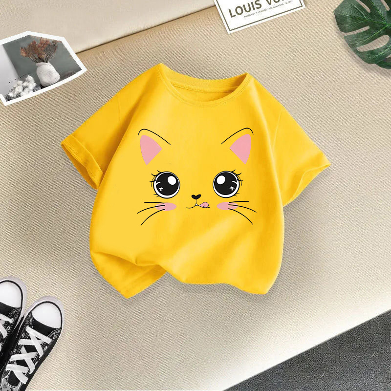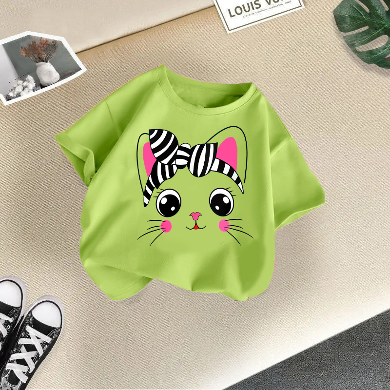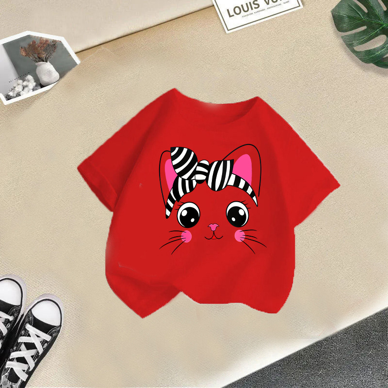 2024 새로운 국경 소녀 반팔 어린이 티셔츠 귀여운 고양이 인쇄 올매치 어린이 여름 트렌디 탑스토어 가기