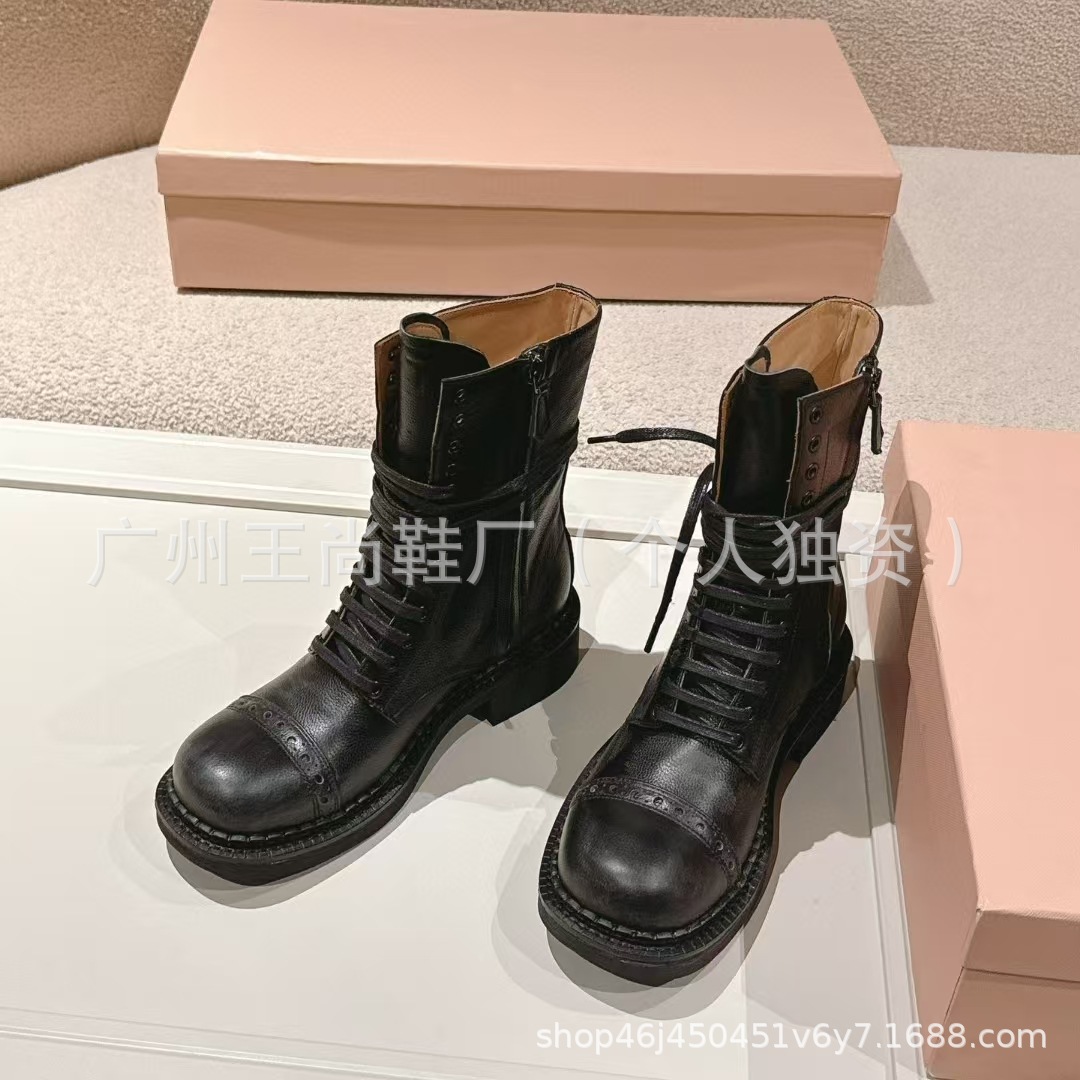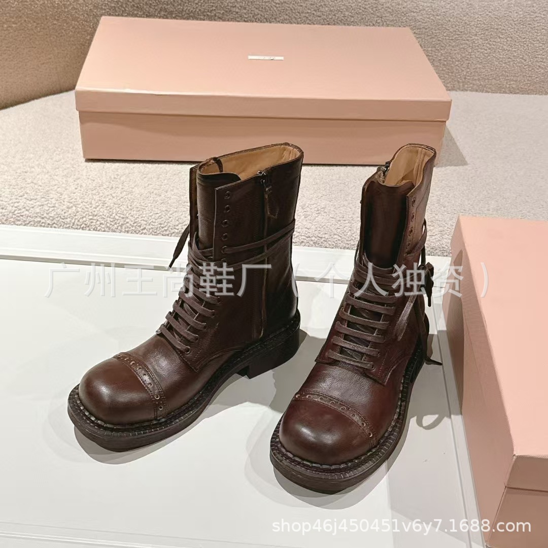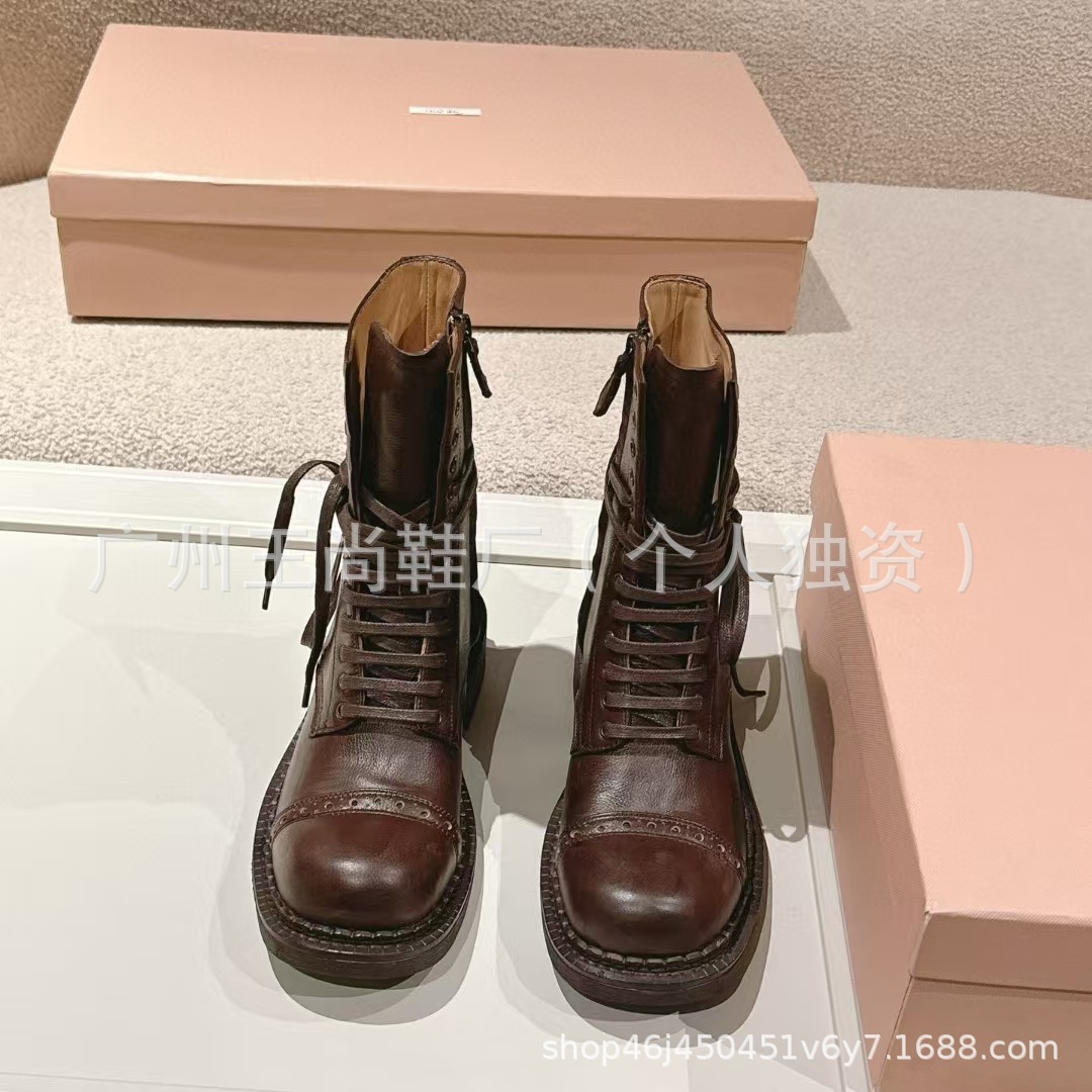 2024 가을과 겨울 새로운 miu 가죽 마틴 부츠 수제 오래된 유럽과 미국 스타일의 부츠 레이스 업 나이트 부츠 여성