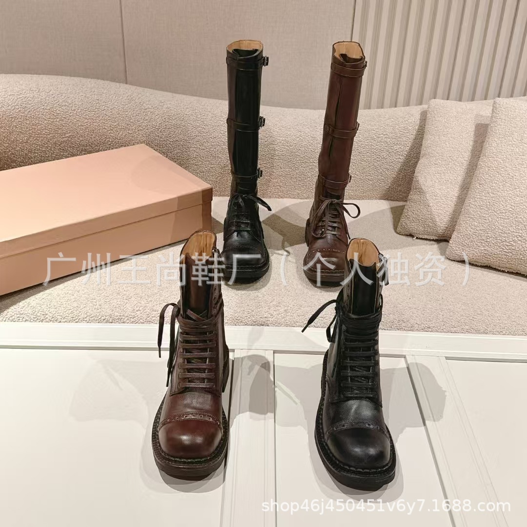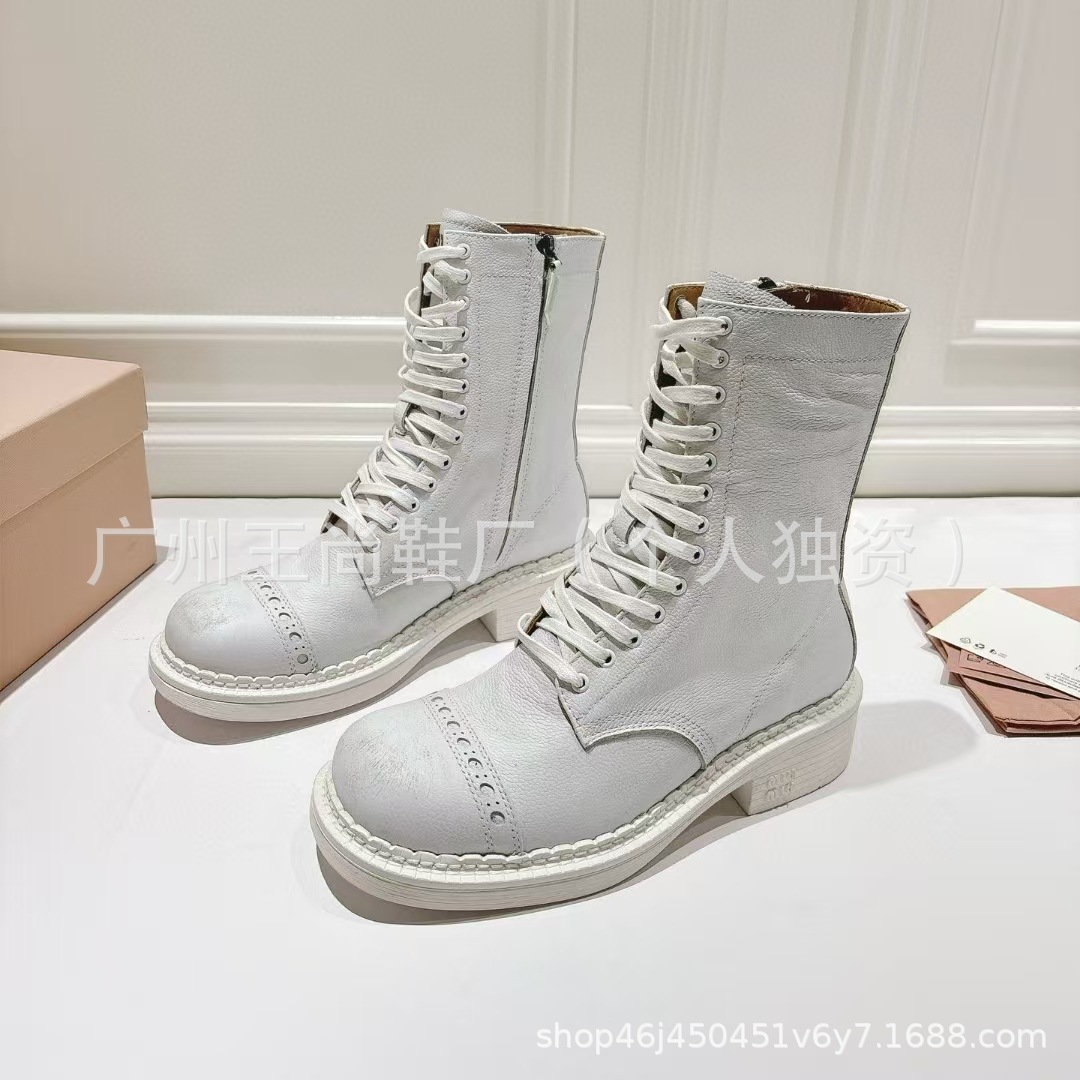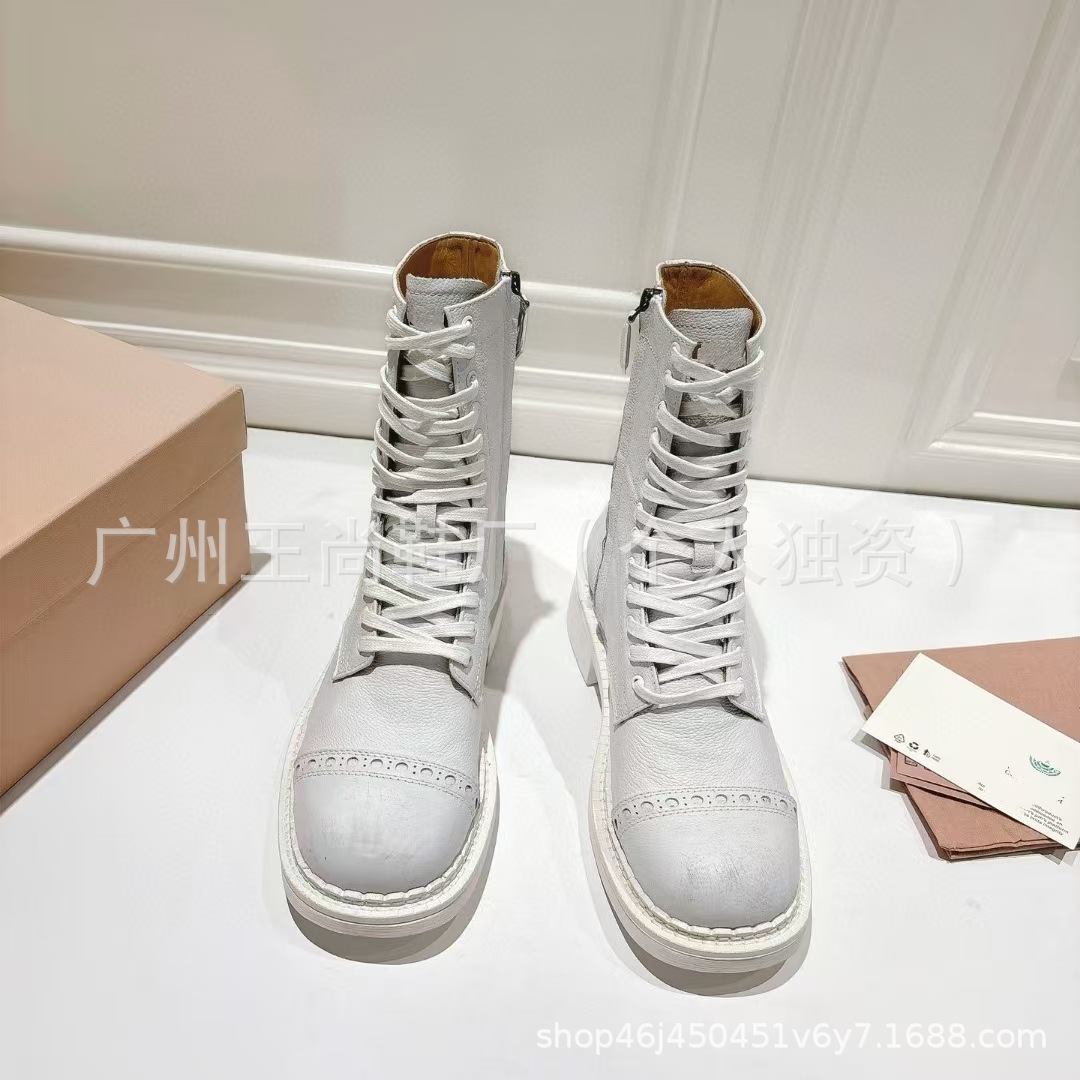 2024 가을과 겨울 새로운 miu 가죽 마틴 부츠 수제 오래된 유럽과 미국 스타일의 부츠 레이스 업 나이트 부츠 여성
