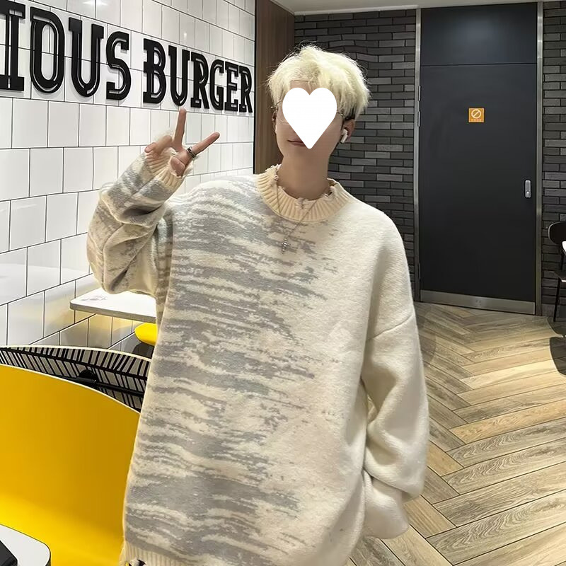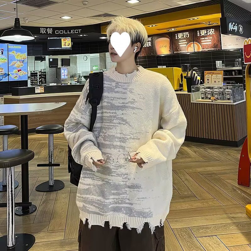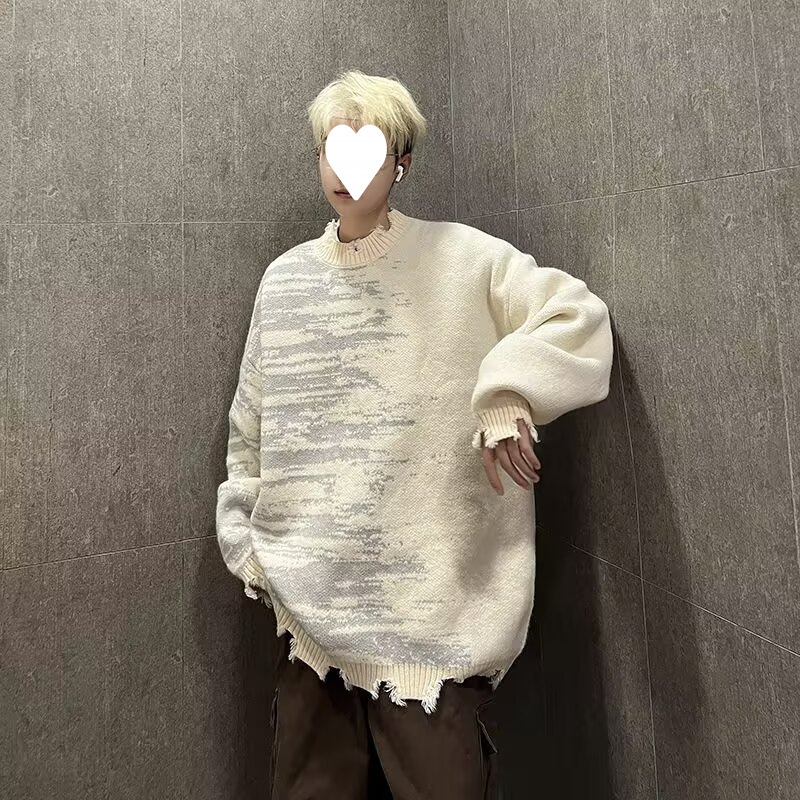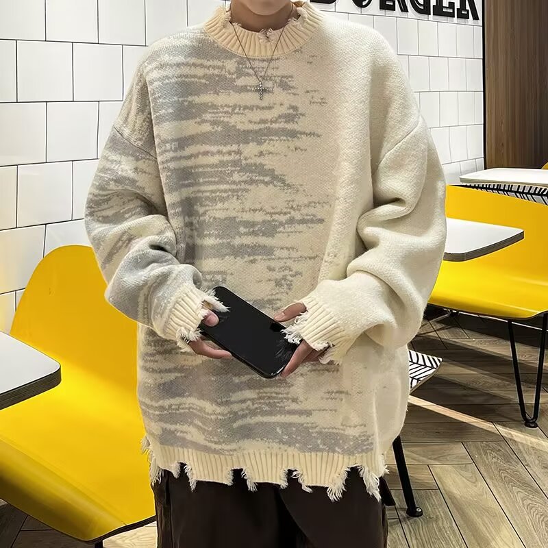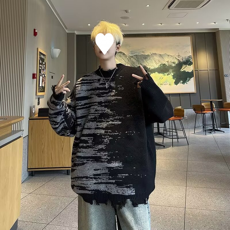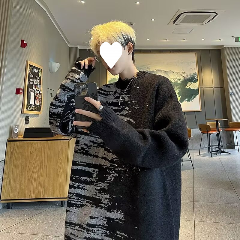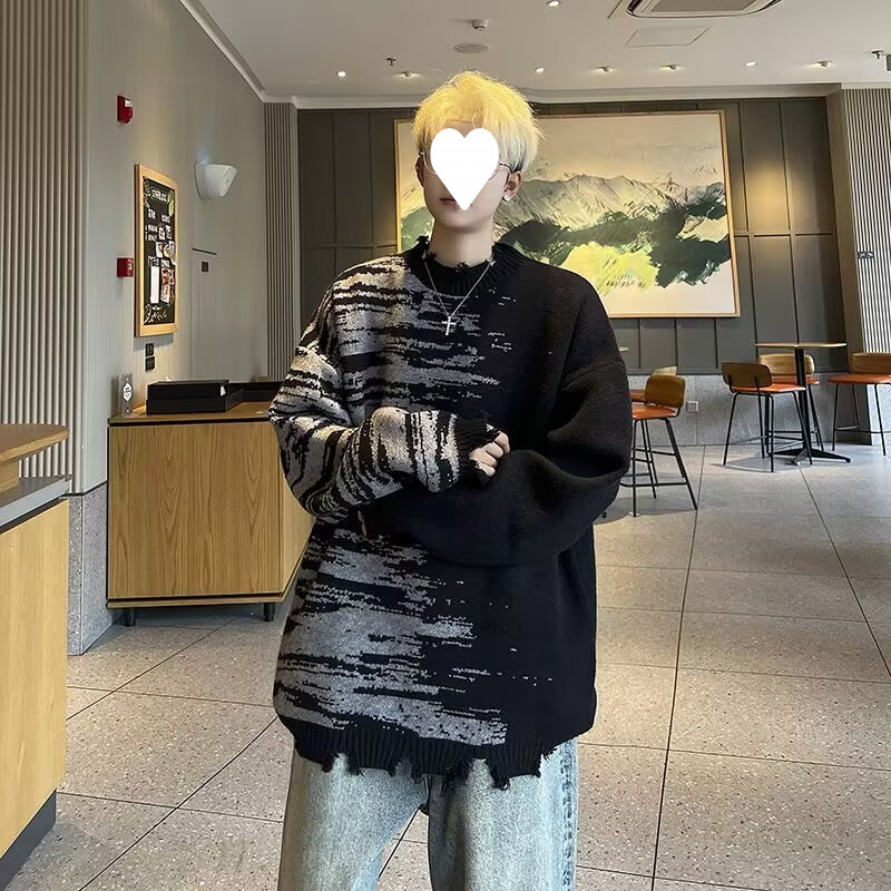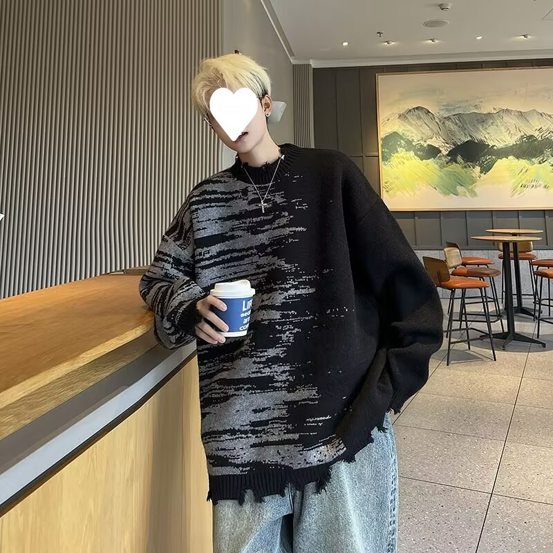 잘 생긴 구멍 디자인 트렌디 한 브랜드 대비 컬러 크루 넥 스웨터 남성 가을과 겨울 커플의 최고 느슨한 니트 풀오버 재킷스토어 가기