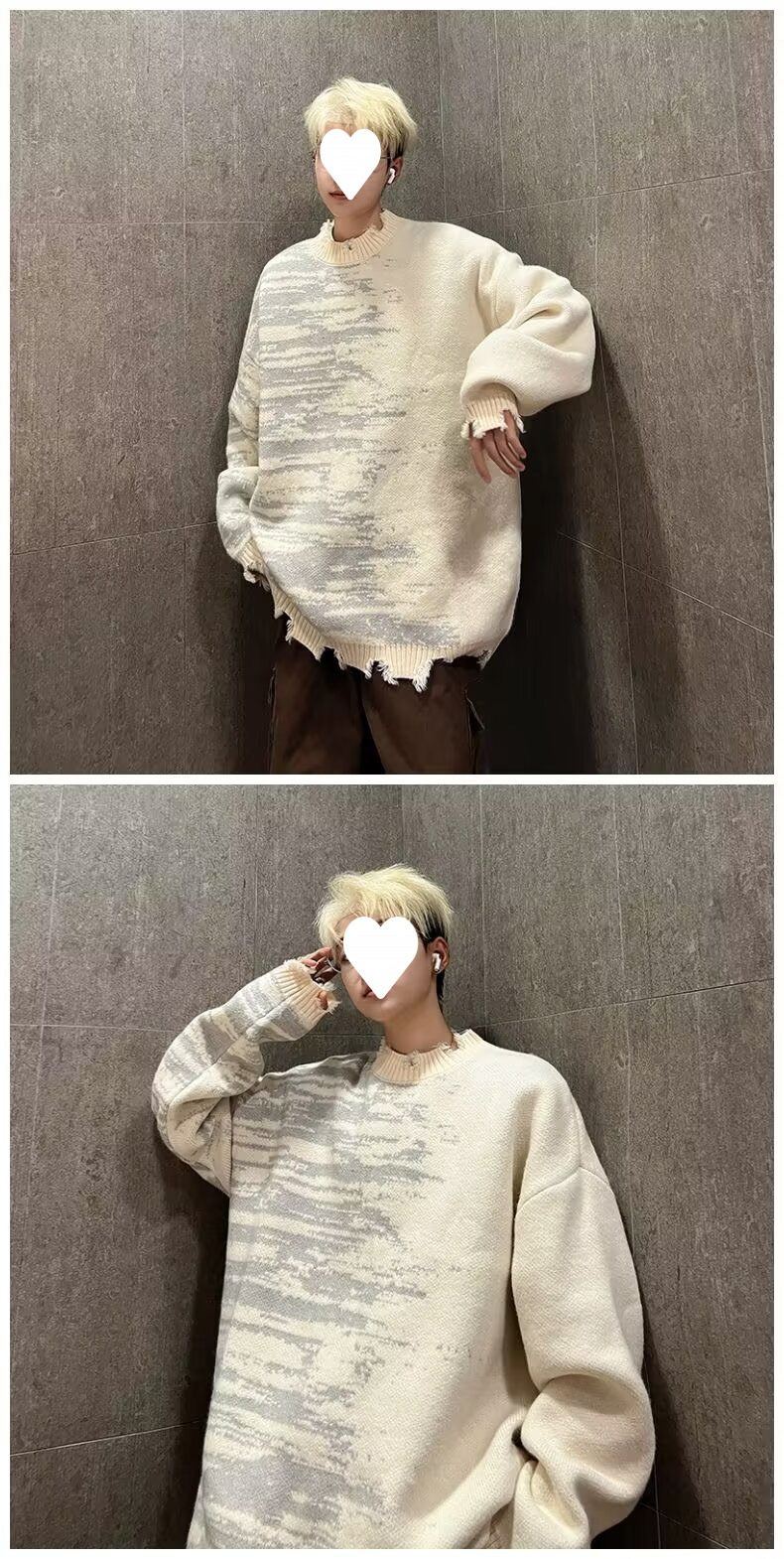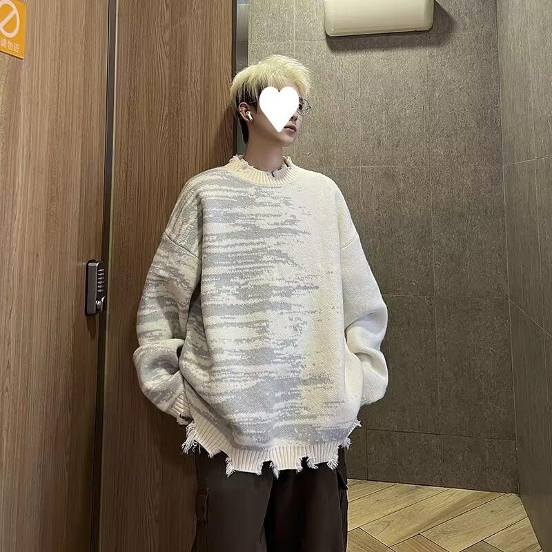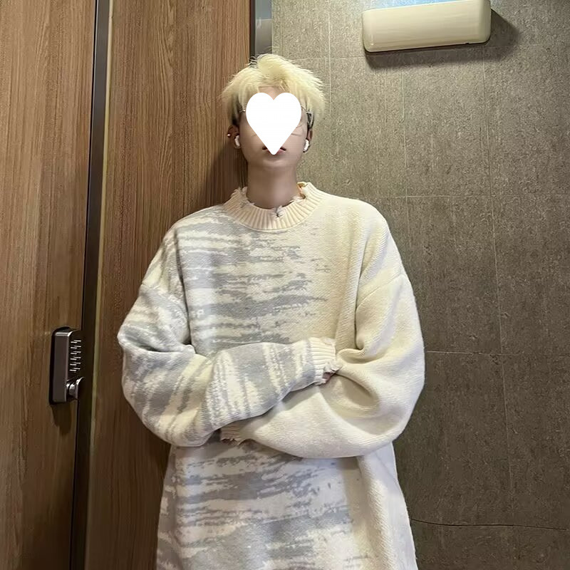 잘 생긴 구멍 디자인 트렌디 한 브랜드 대비 컬러 크루 넥 스웨터 남성 가을과 겨울 커플의 최고 느슨한 니트 풀오버 재킷