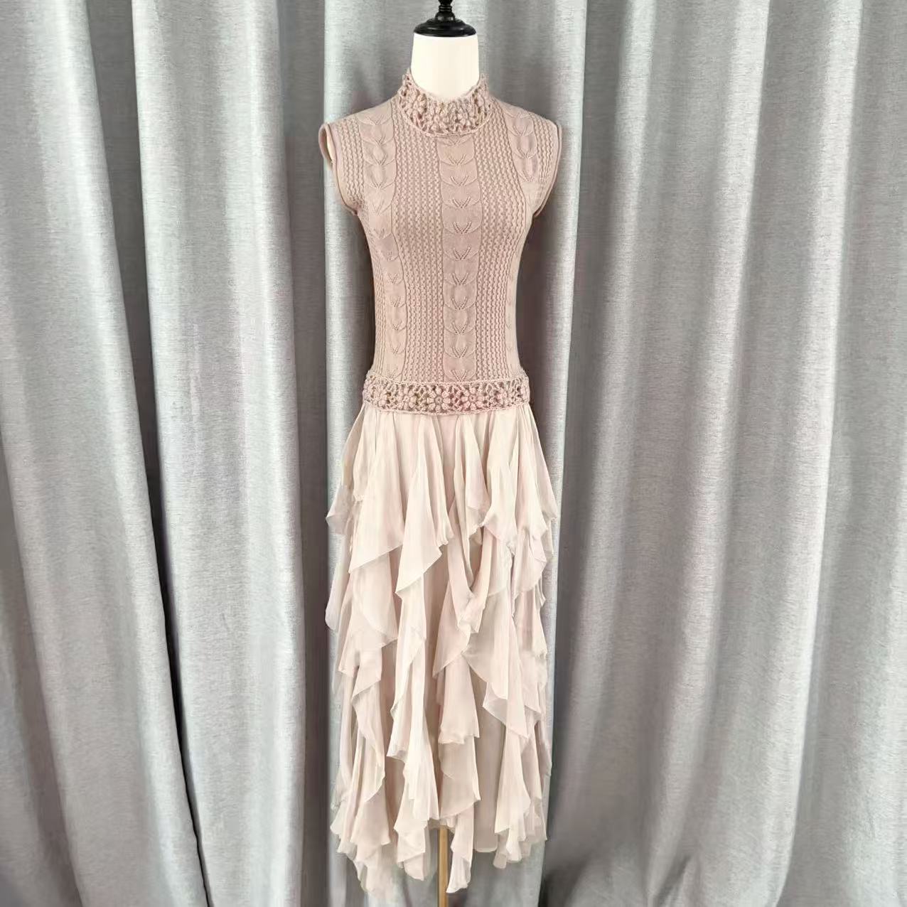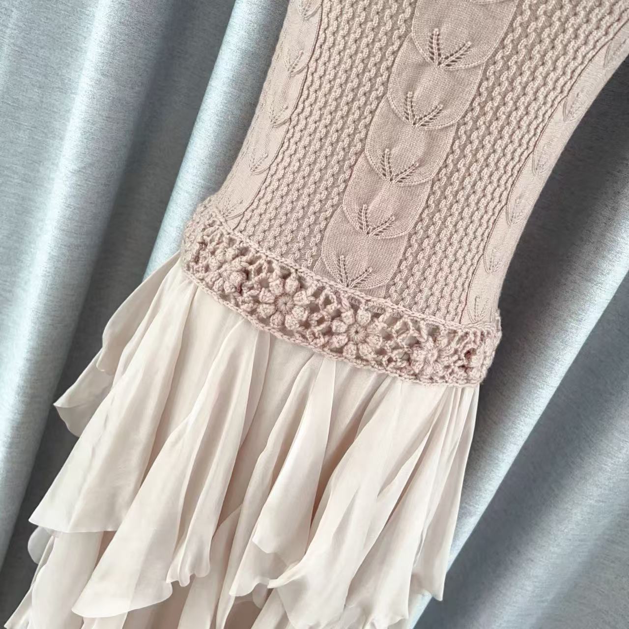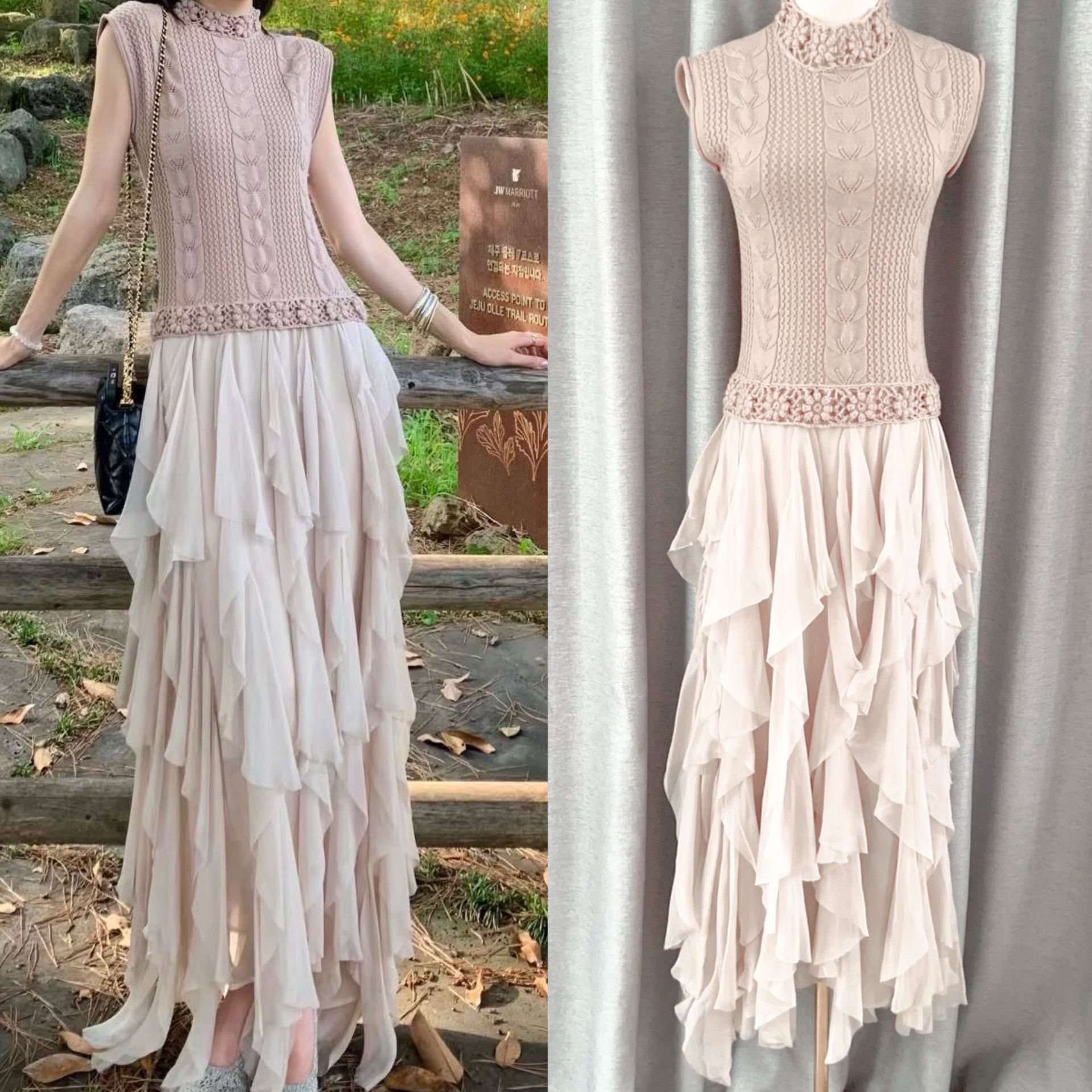 재고 있음/2026 니트 패치워크 원피스 여성 가을 겨울 우아한 솔리드 컬러 아름다운 롱 원피스