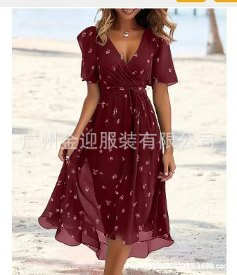 2024 새로운 국경 전자 상거래 아마존 느슨한 레저 슈야 V 칼라 꽃 새로운 뜨거운 판매 인쇄 원피스