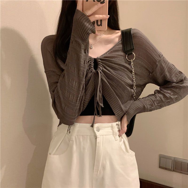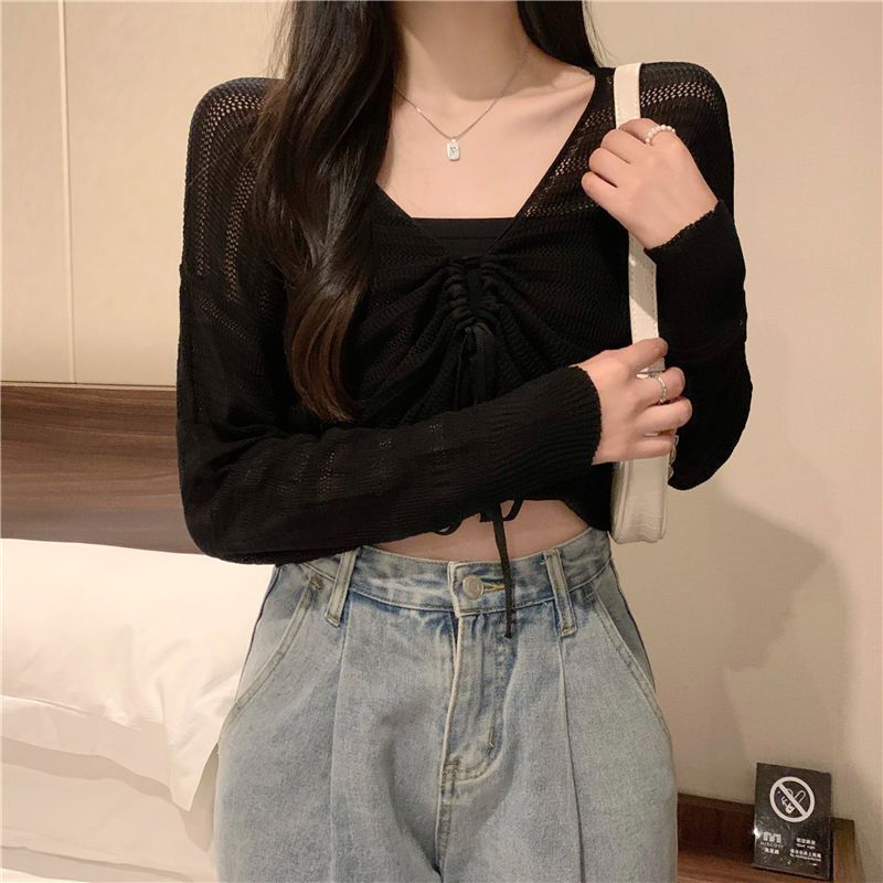 여름 2024 새로운 할로우 드로우 스트링 니트 셔츠 작은 코트 디자인 감각 외부 선 스크린 블라우스 짧은 최고 여성스토어 가기