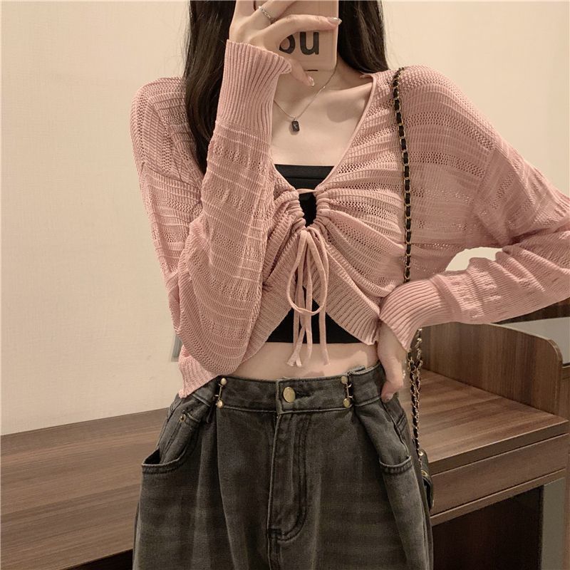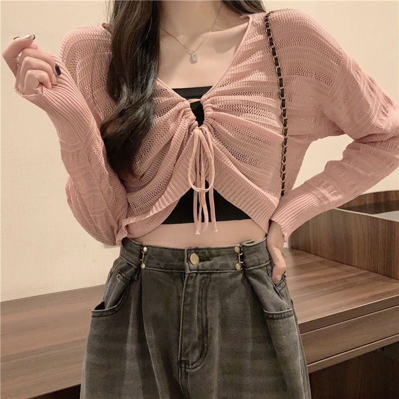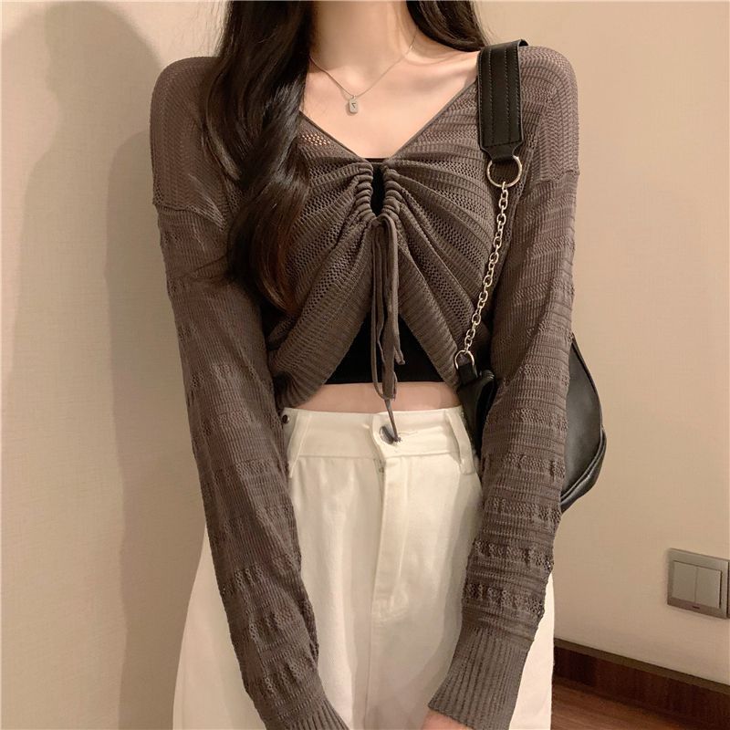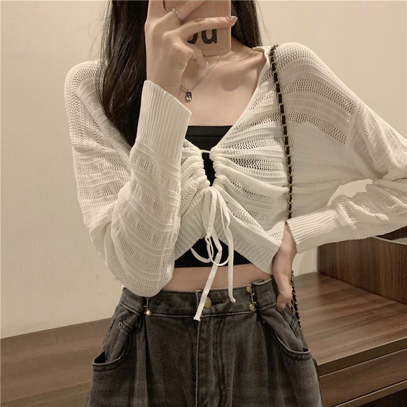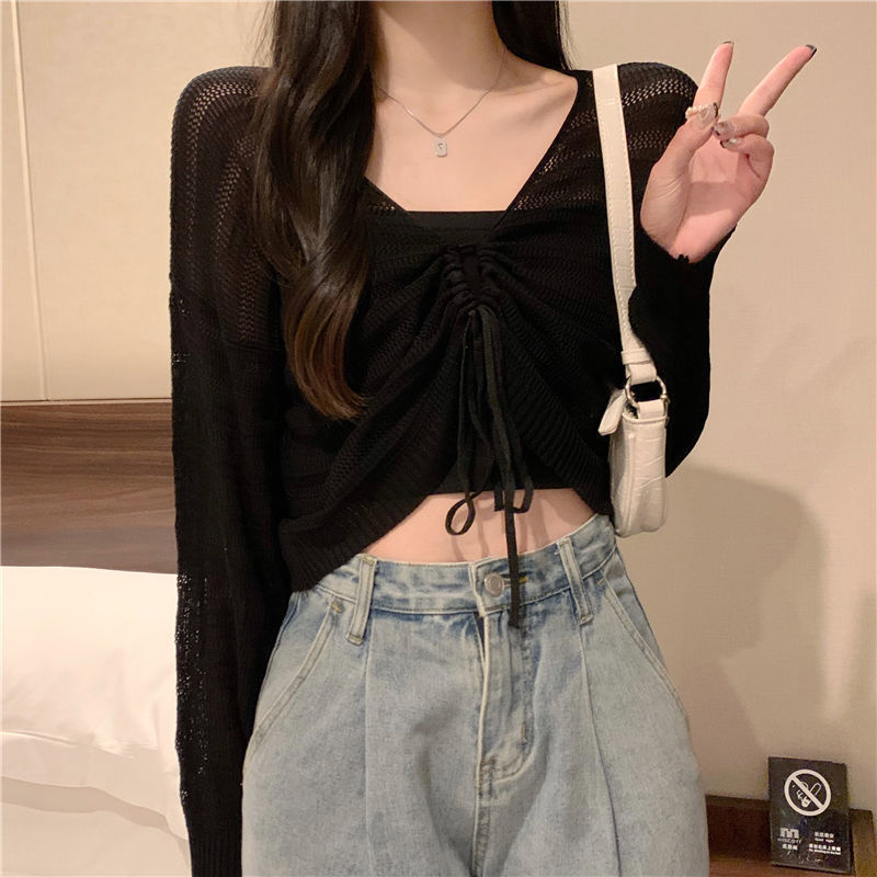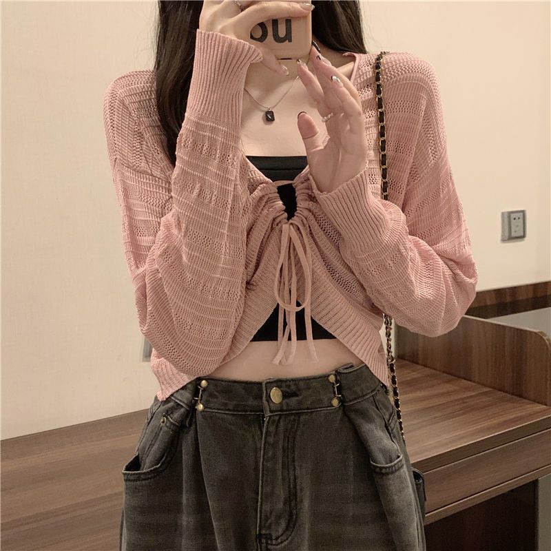 여름 2024 새로운 할로우 드로우 스트링 니트 셔츠 작은 코트 디자인 감각 외부 선 스크린 블라우스 짧은 최고 여성