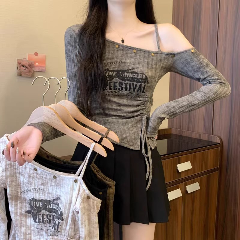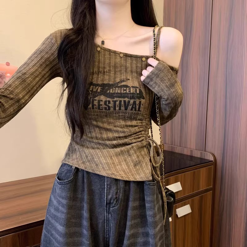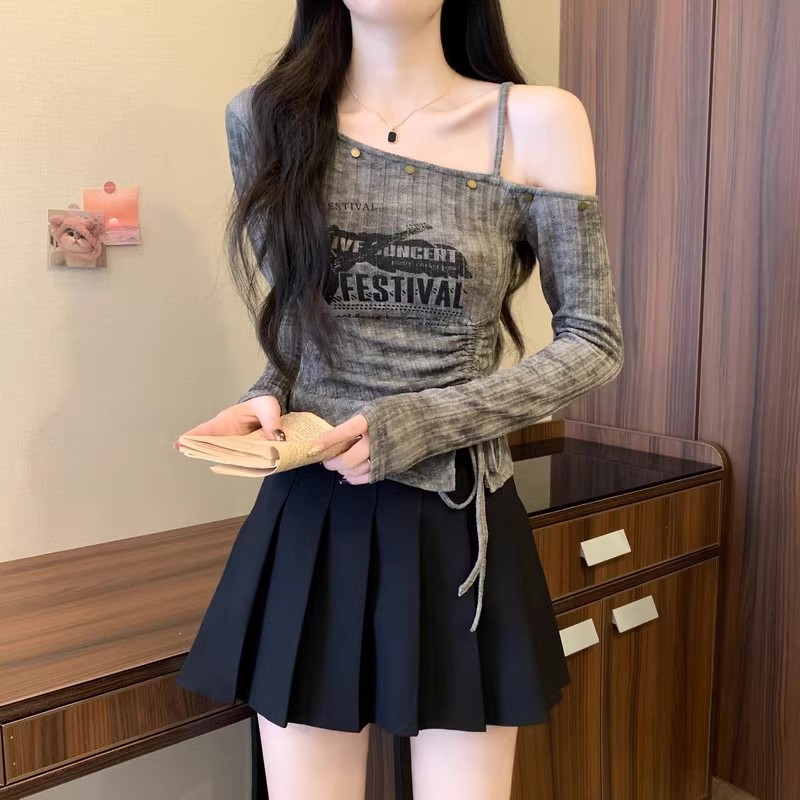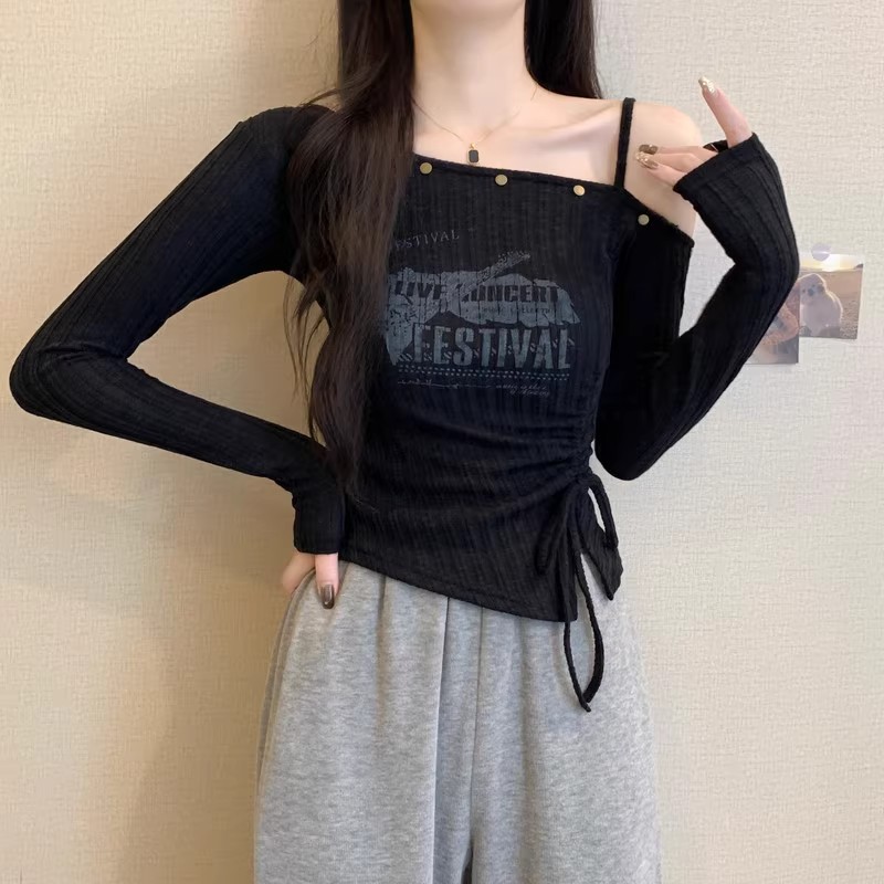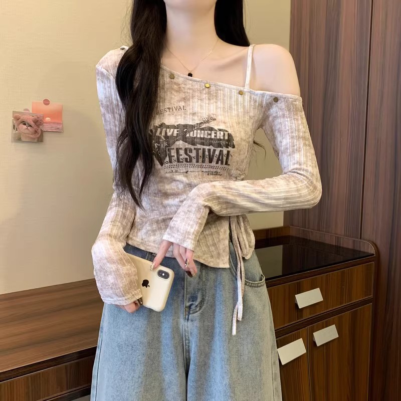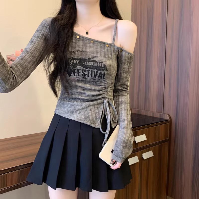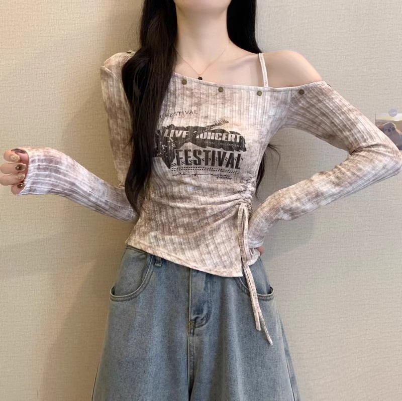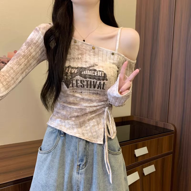 겨울 신상 드로스트링 프린트 반팔 오프숄더 긴팔 셔츠 여성용 가을 슬림핏 탑