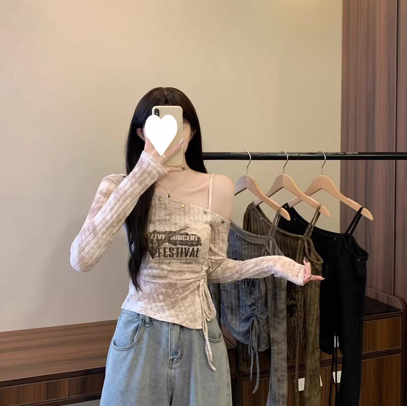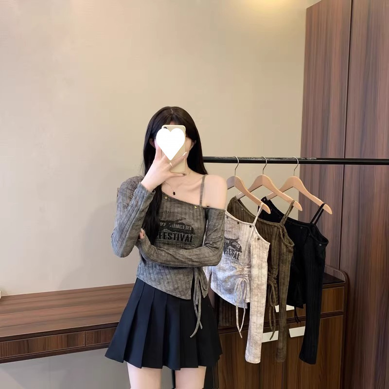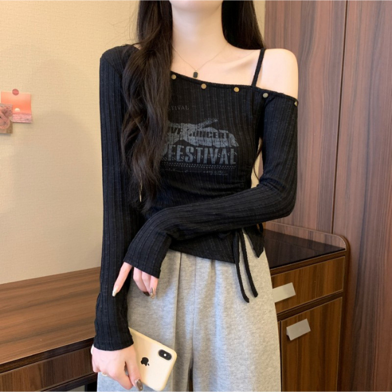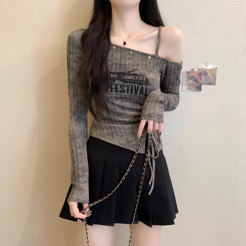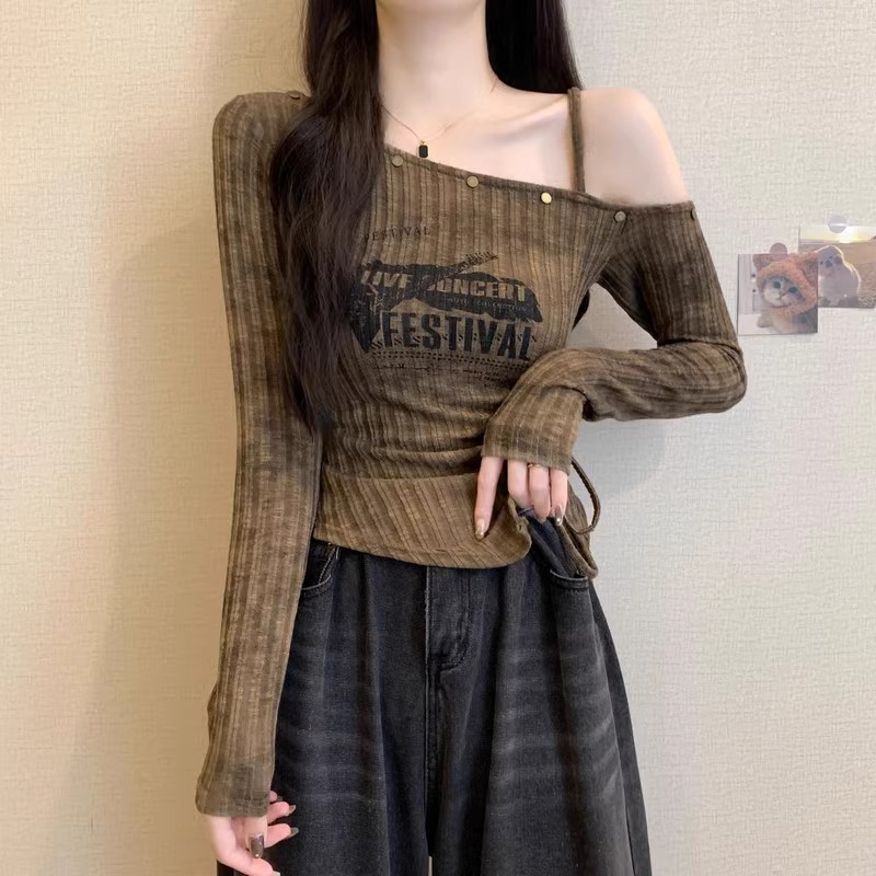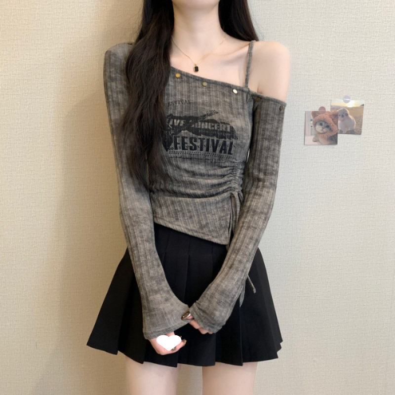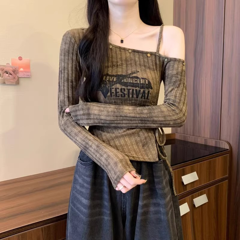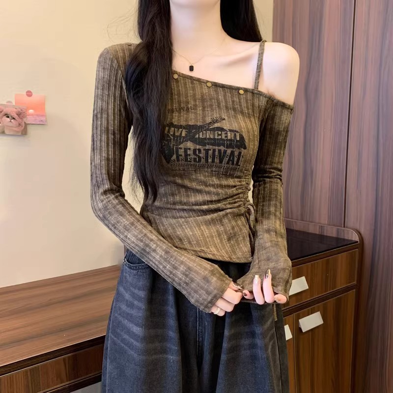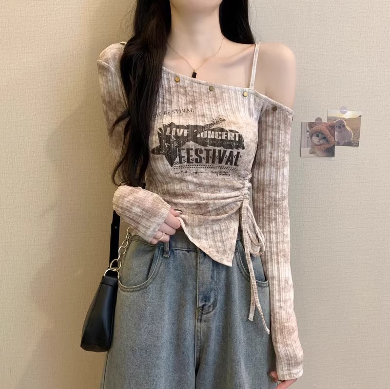 겨울 신상 드로스트링 프린트 반팔 오프숄더 긴팔 셔츠 여성용 가을 슬림핏 탑