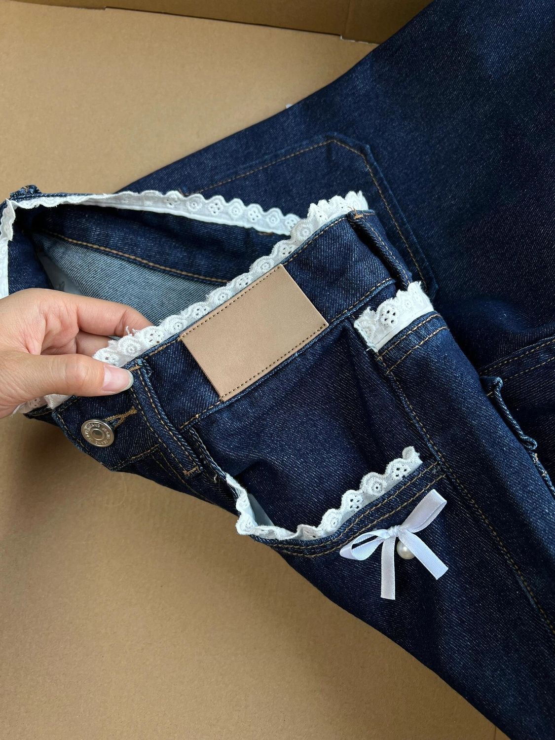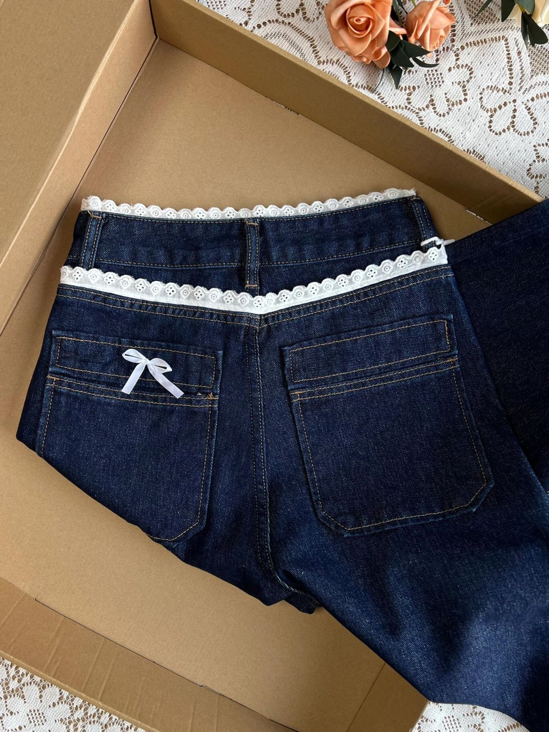 아메리칸 스타일 레트로 다크 블루 레이스 청바지 여성용 가을 레이스 하이 허리 스트레이트 루즈 바지스토어 가기