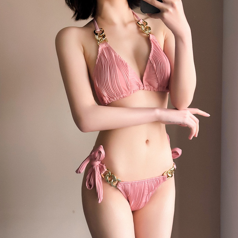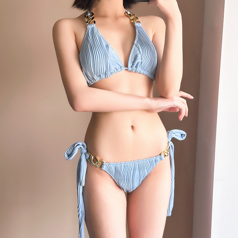 2024 새로운 무지개 색 3 점 비키니 타이 섹시한 뜨거운 소녀 낮은 허리 단색 큰 가슴 등이없는 수영 세트스토어 가기