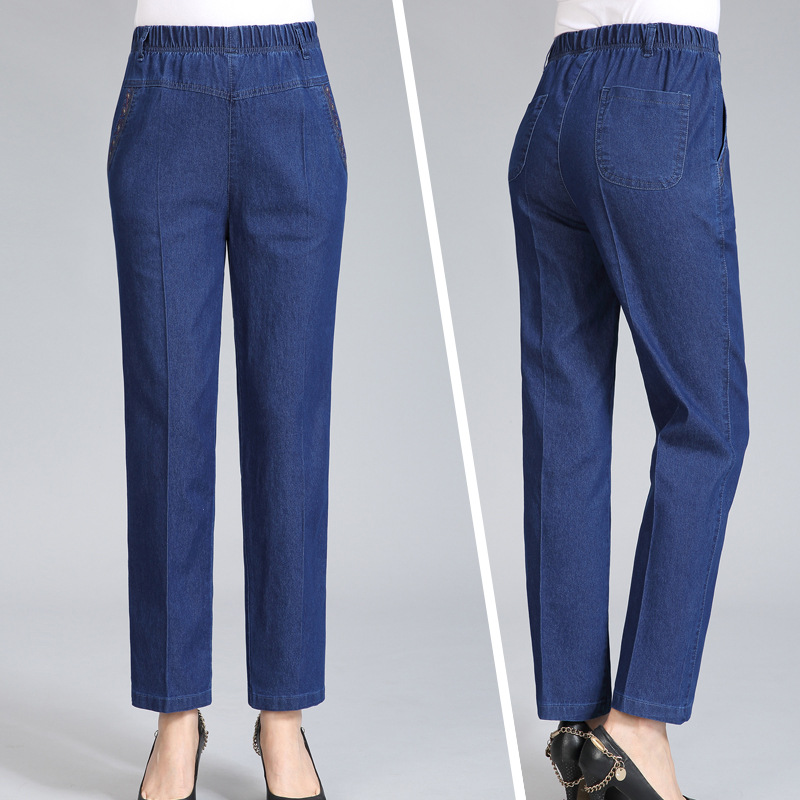 어머니의 봄과 여름 얇은 청바지 중년 및 노인 여성의 탄성 높은 허리 탄성 느슨한 바지 새 봄과 가을 옷