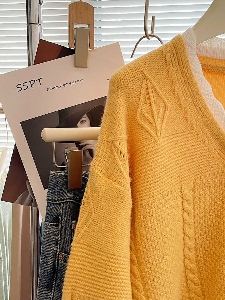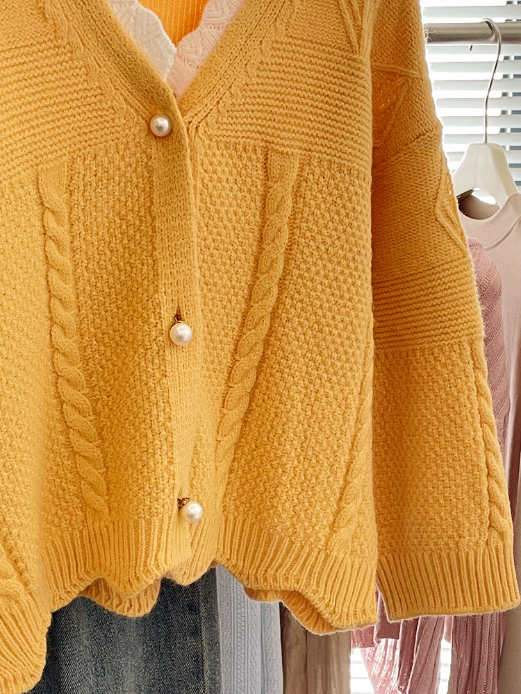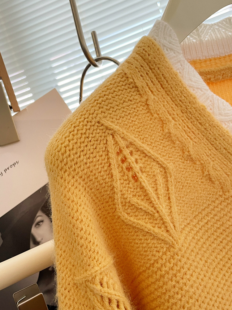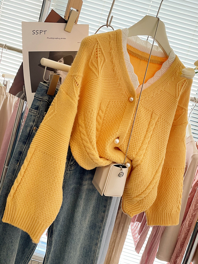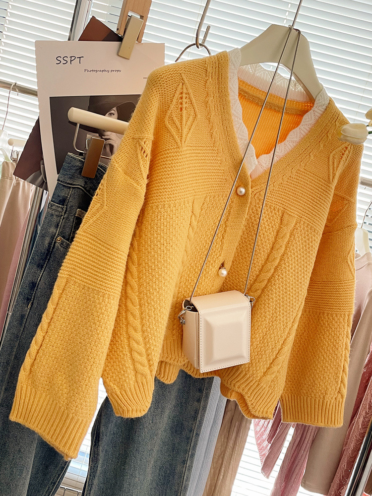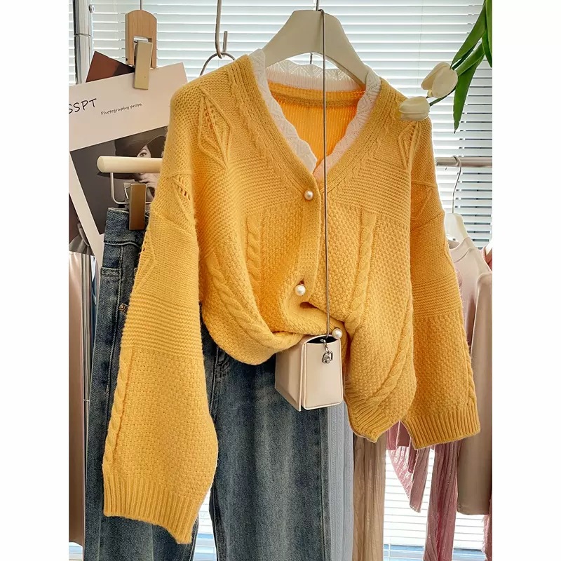 小众蕾丝拼接花边v领针织开衫女宽松慵懒风休闲百搭麻花毛衣外套