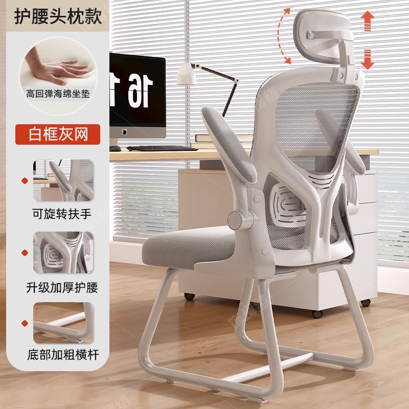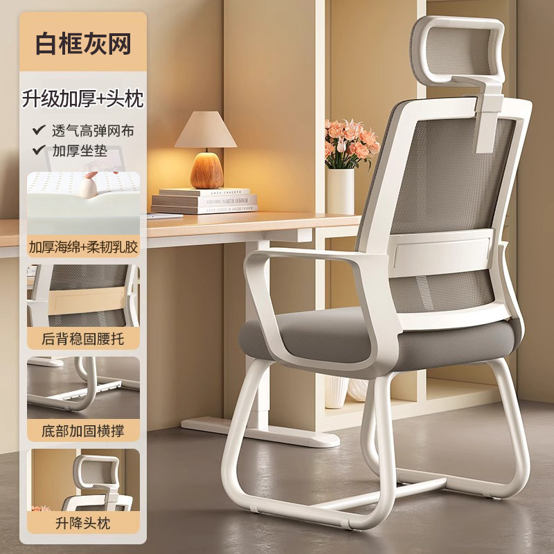 • [고급 두꺼워진 허리받침 머리받침 모델] 화이트 프레임 그레이 메쉬 + 두꺼워진 스펀지 쿠션 + 리프팅 머리받침