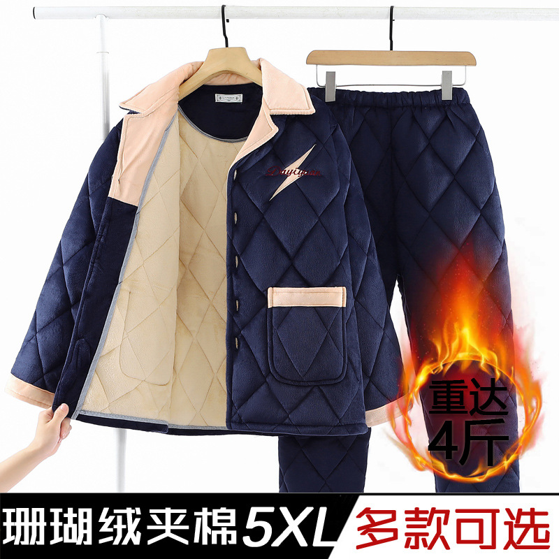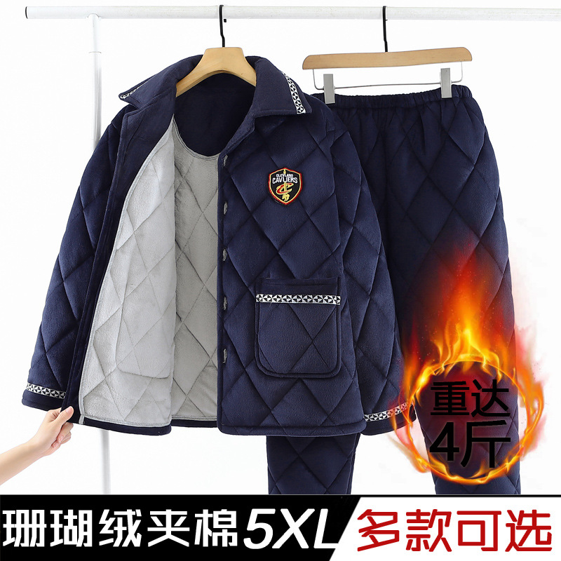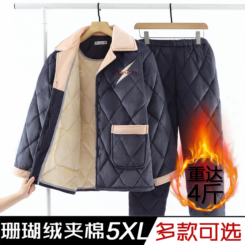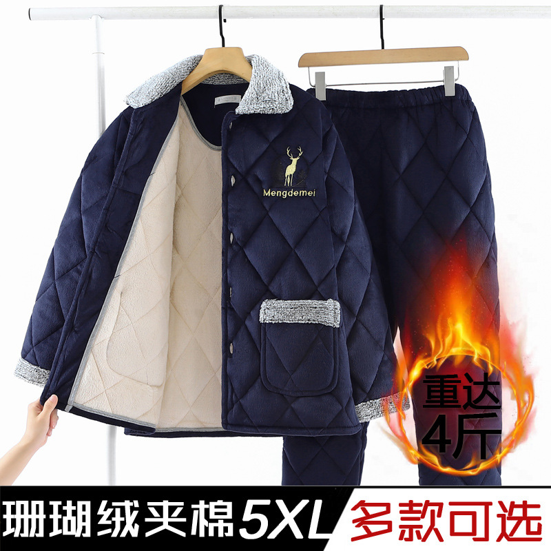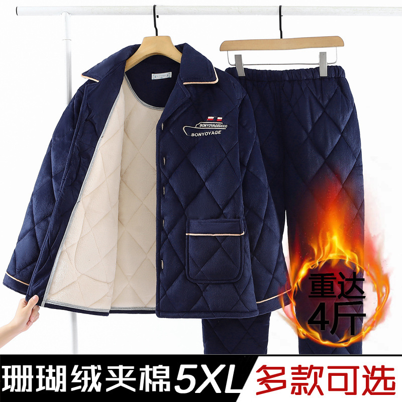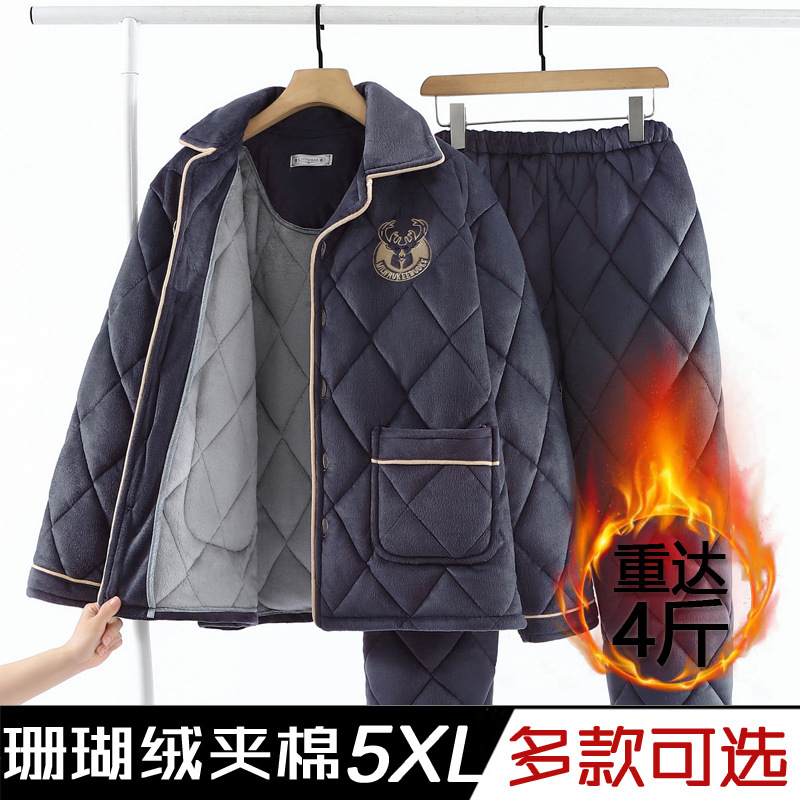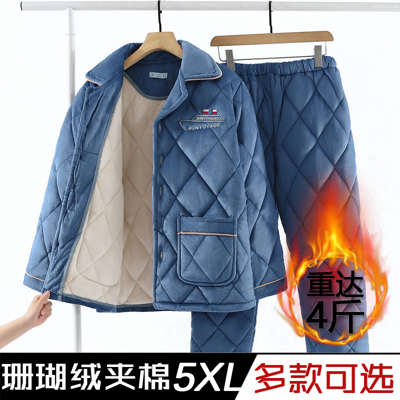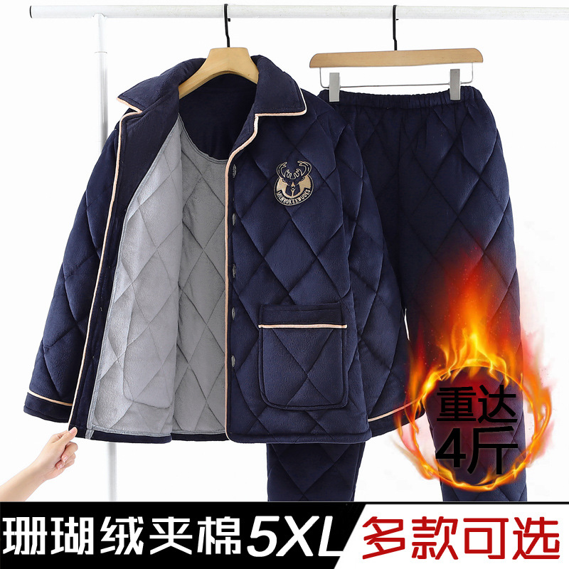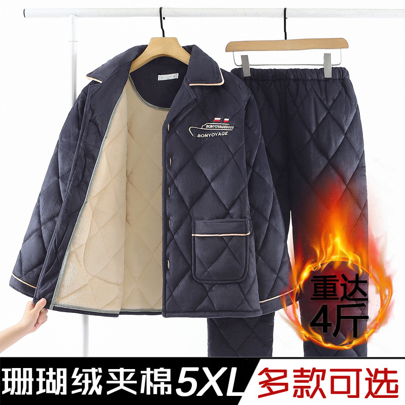 잠옷 겨울 남자 3 층 기모 두꺼운 산호 양털 퀼트 따뜻한 중년 아빠 홈 옷 플러스 사이즈 세트스토어 가기