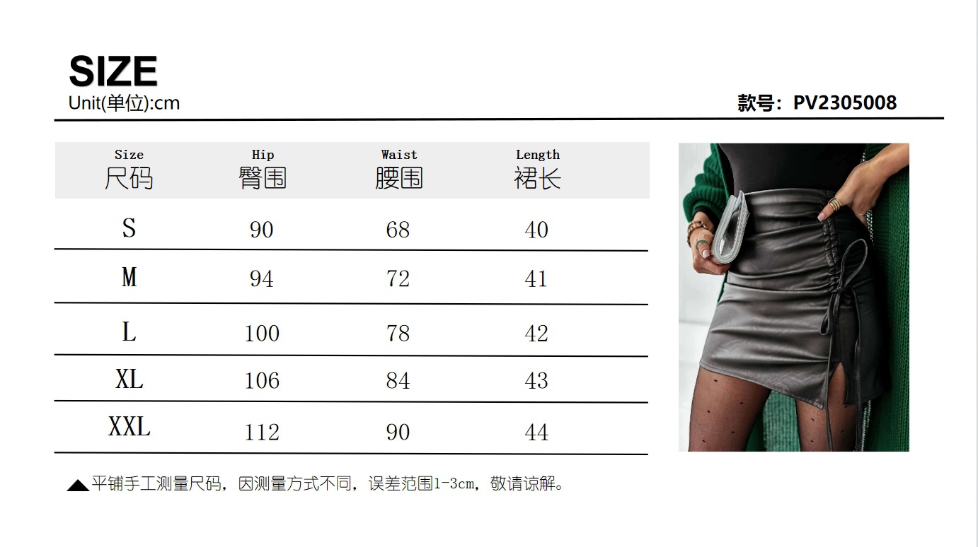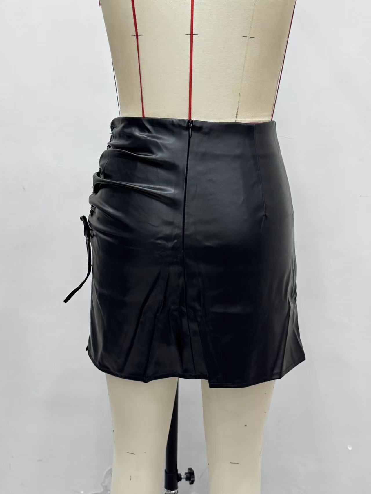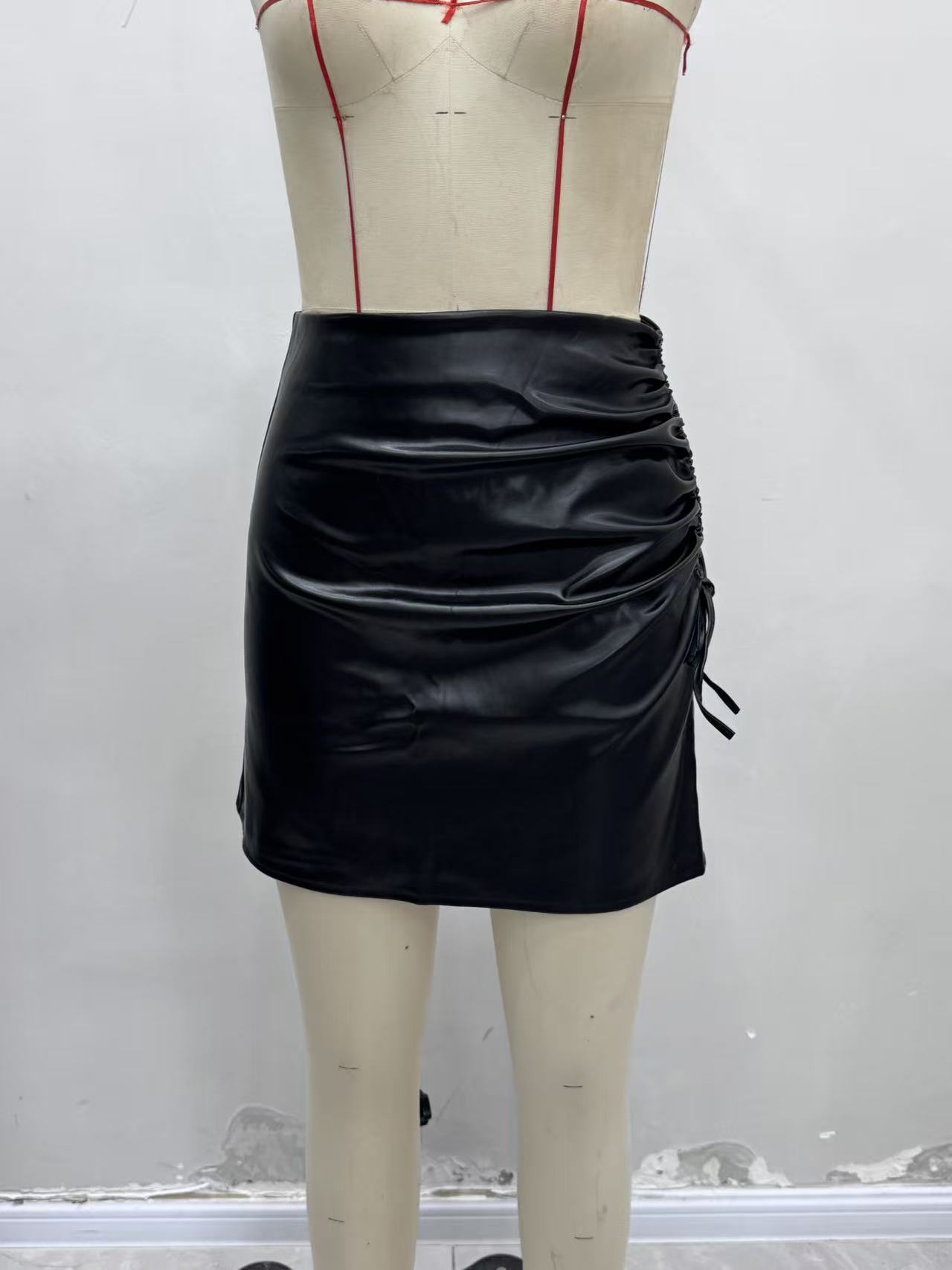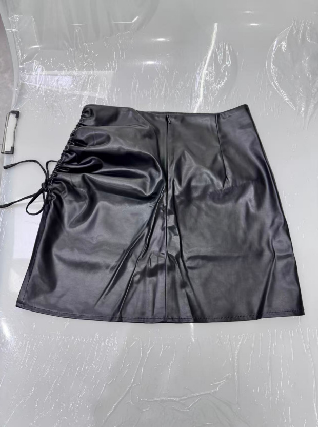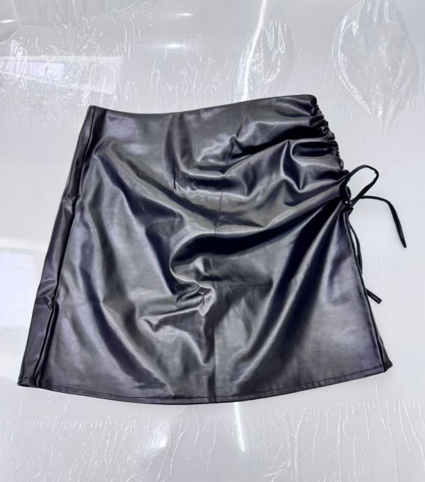 가을과 겨울 디자인 섹시한 스파이스 소녀 솔리드 컬러 드로우 스트랩 스플릿 작은 스윙 높은 허리 엉덩이 PU 가죽 미니 스커트