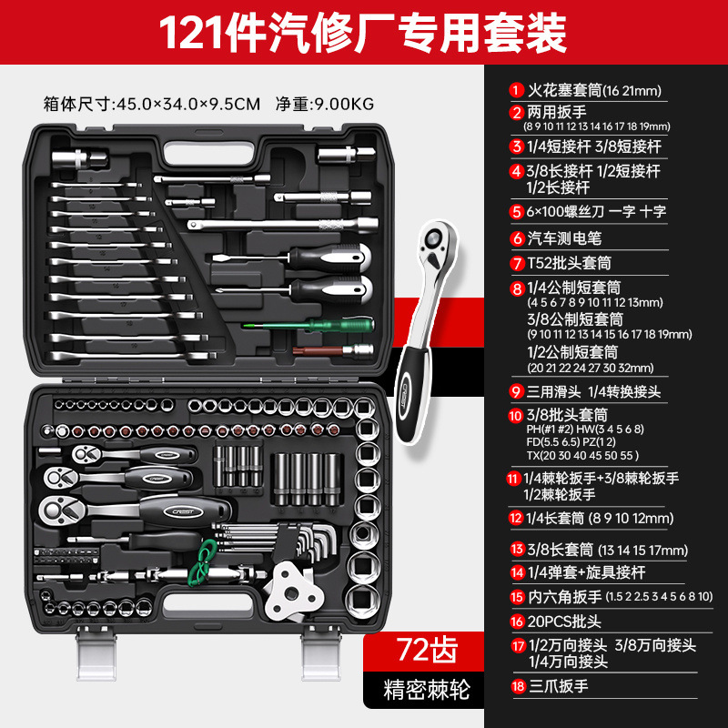 • 121피스 자동차 수리 세트 [곡선형 핸들 72톱니 크롬 바나듐강]