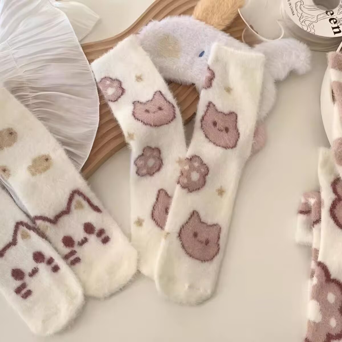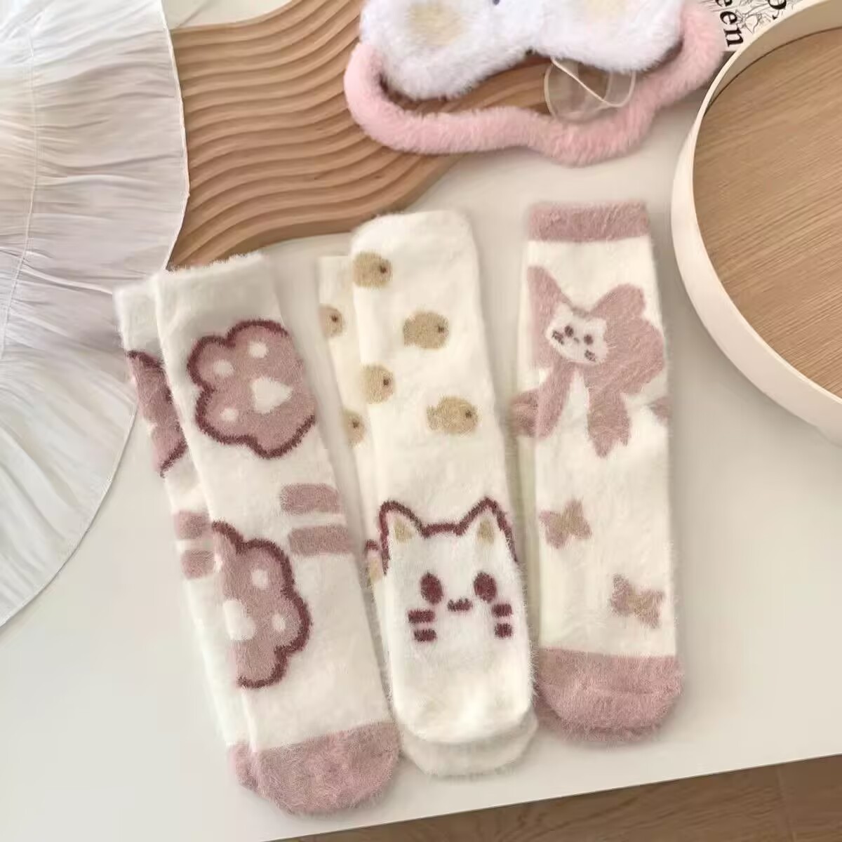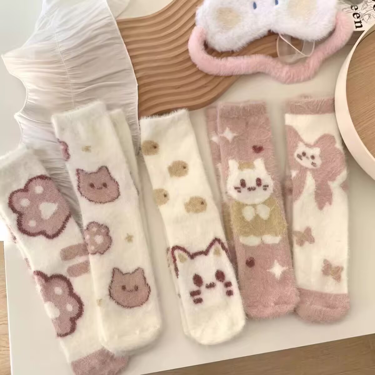 가을과 겨울 두꺼운 기모 밍크 벨벳 핑크 새끼 고양이 양말 여성용 튜브 양말 귀여운 달콤한 집 따뜻한 스타킹