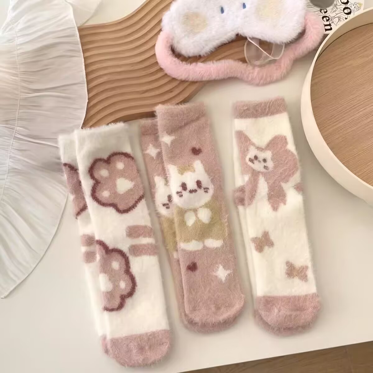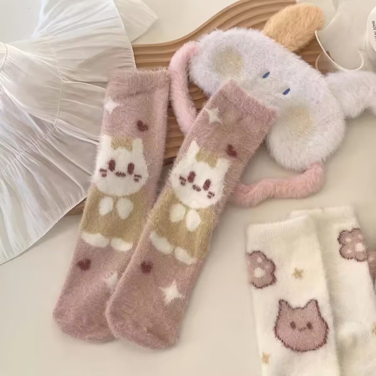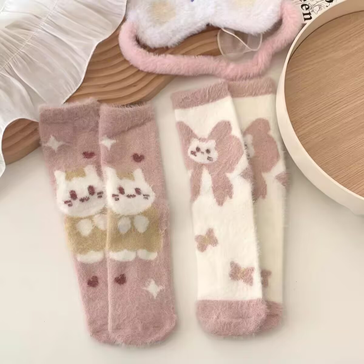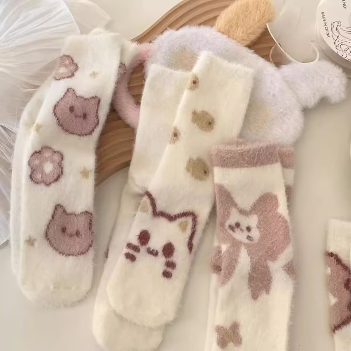 가을과 겨울 두꺼운 기모 밍크 벨벳 핑크 새끼 고양이 양말 여성용 튜브 양말 귀여운 달콤한 집 따뜻한 스타킹