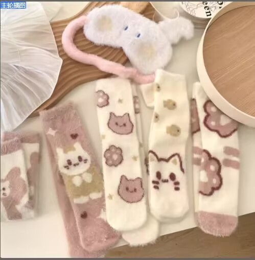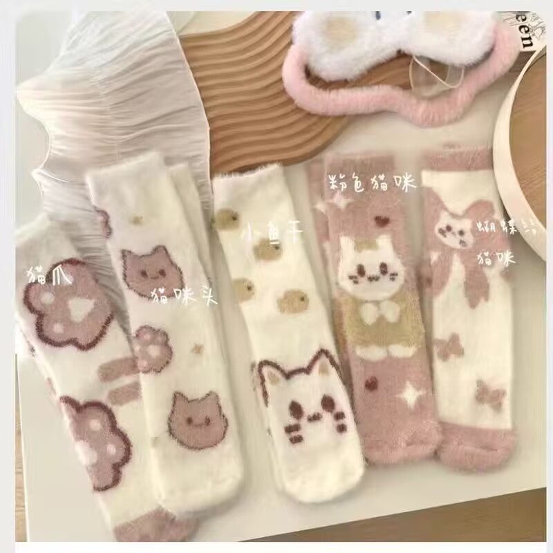 가을과 겨울 두꺼운 기모 밍크 벨벳 핑크 새끼 고양이 양말 여성용 튜브 양말 귀여운 달콤한 집 따뜻한 스타킹스토어 가기