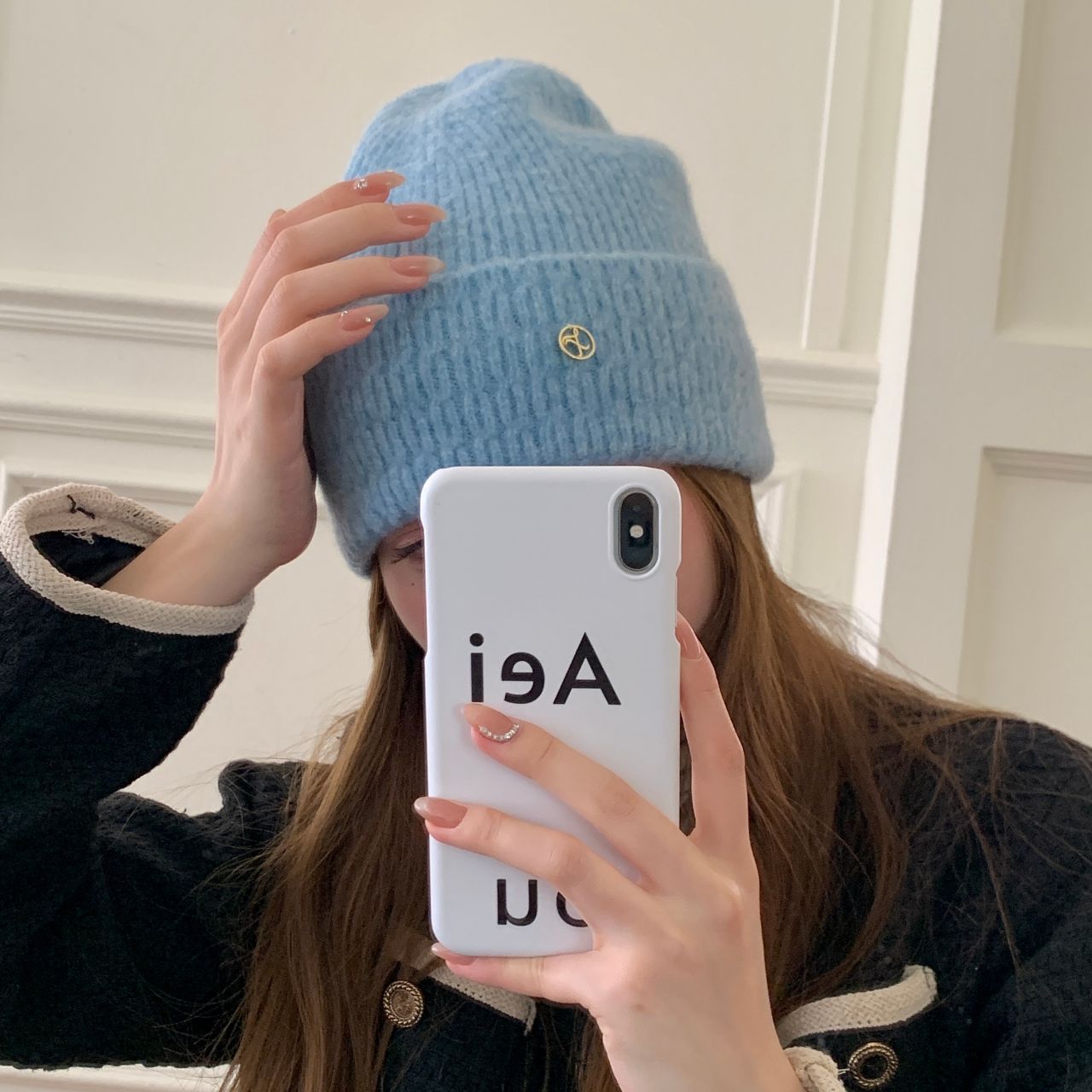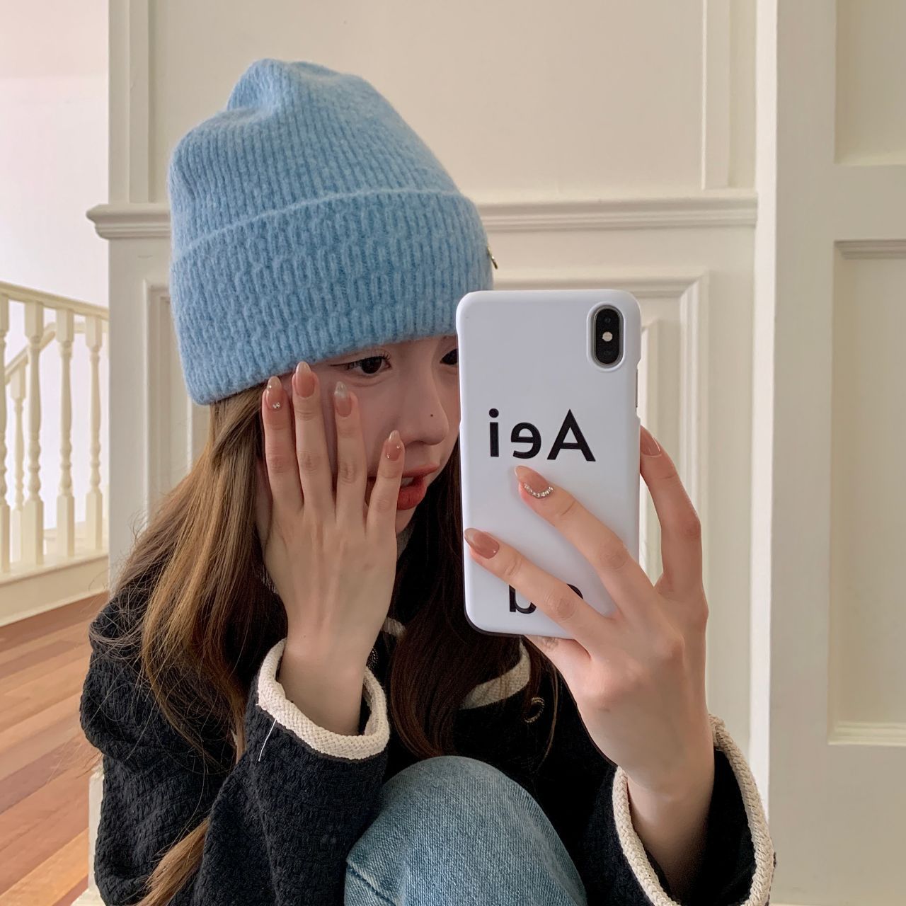가을과 겨울 기본 올매치 니트 모자 중기 간단한 자카드 접이식 헤드 캡 여성의 겨울 따뜻한 귀 보호 캡