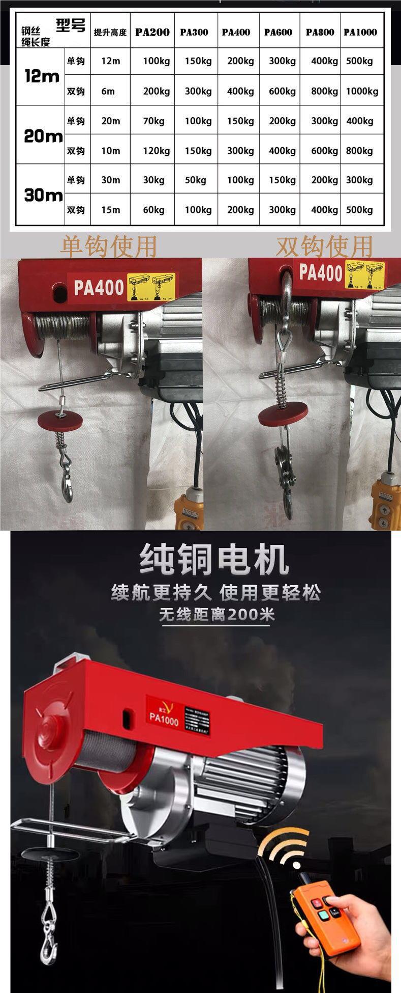 • 단일 후크 400 이중 후크 800kg - 원격 제어 와이어 로프 길이 30m