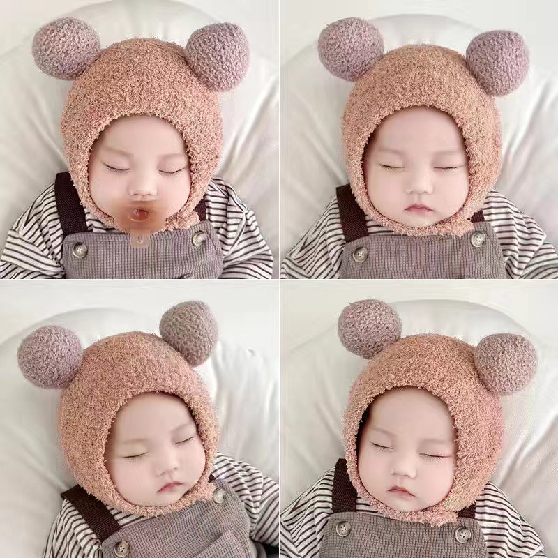 한국 스타일 Ins 가을과 겨울 새로운 아기 귀 보호 캡 따뜻한 냉방 모자 편안한 아기 더블 볼 부드러운 왁스 바오터 캡 트렌디스토어 가기