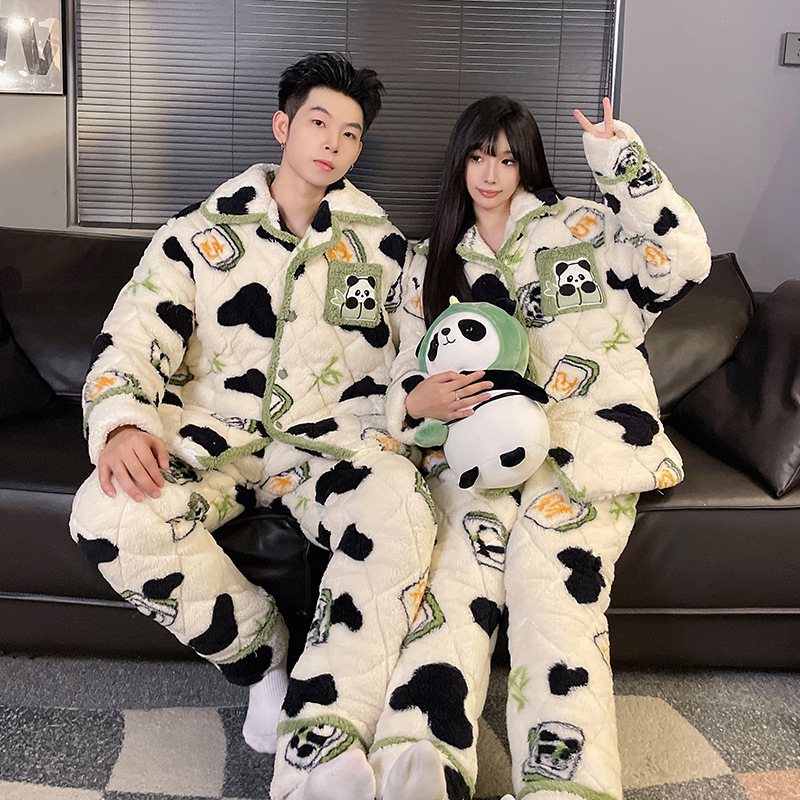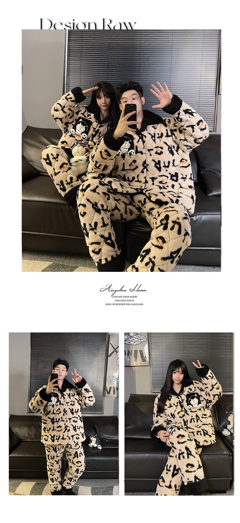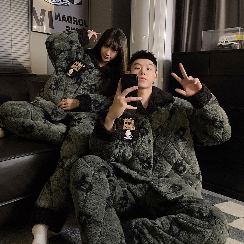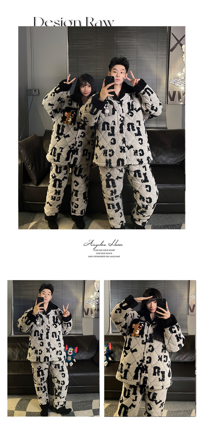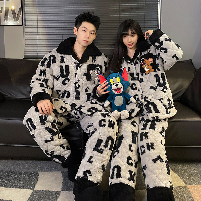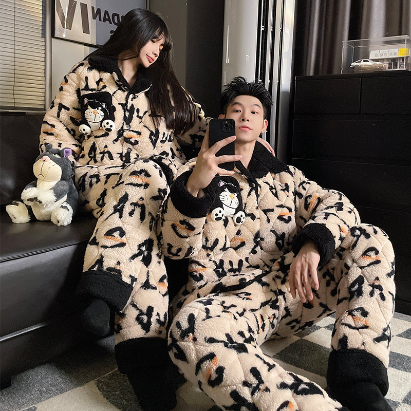 엄선된 3겹 두꺼운 누빔 커플 잠옷 여성용 겨울 신상 만화 카라 가디건 남성용 홈웨어 세트