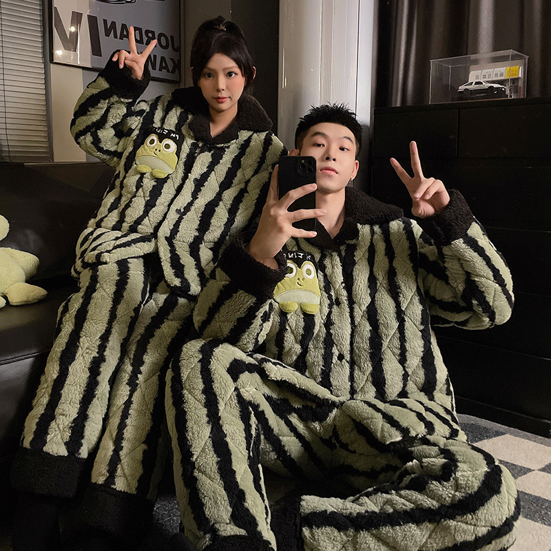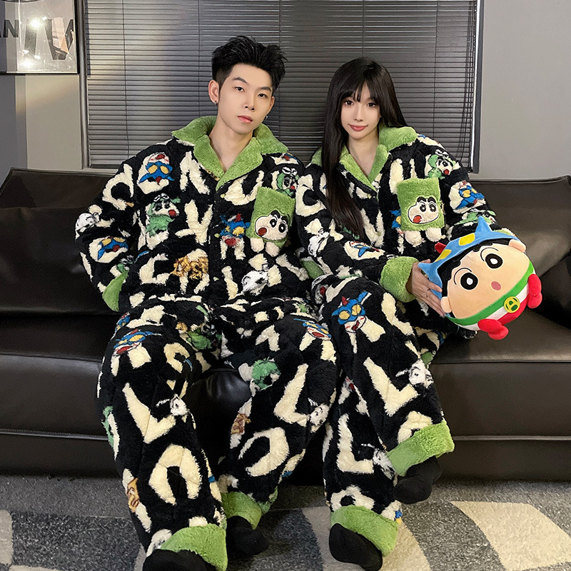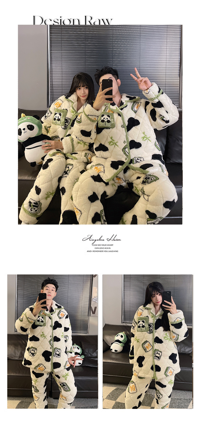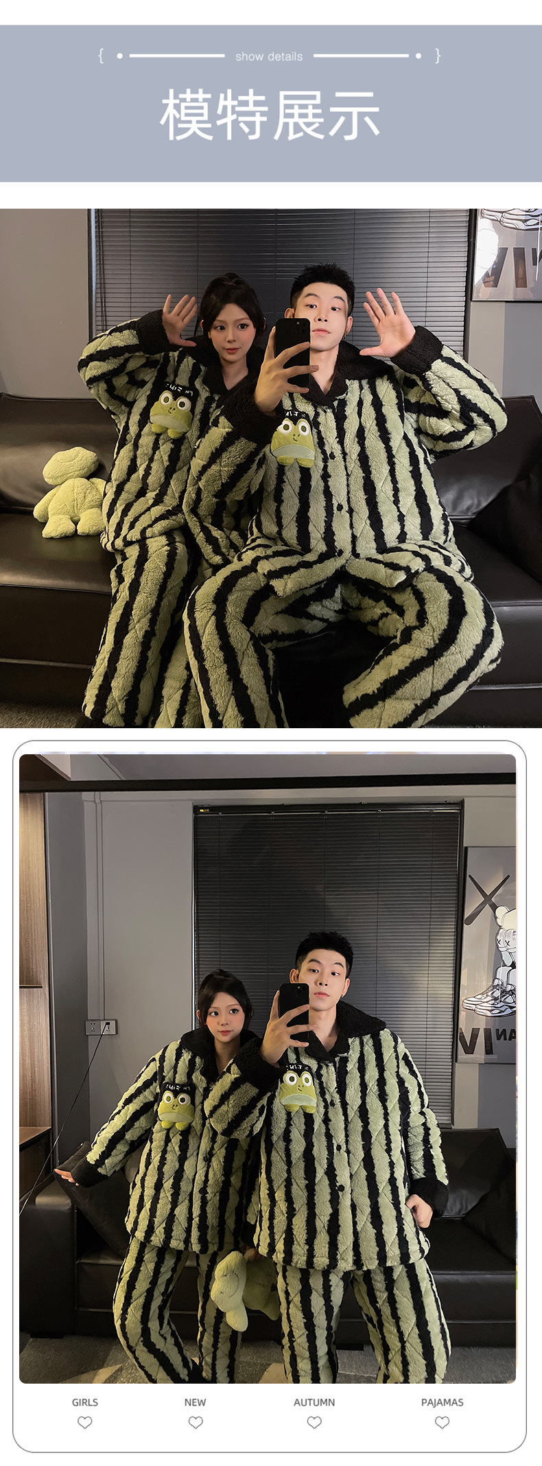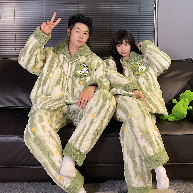 엄선된 3겹 두꺼운 누빔 커플 잠옷 여성용 겨울 신상 만화 카라 가디건 남성용 홈웨어 세트
