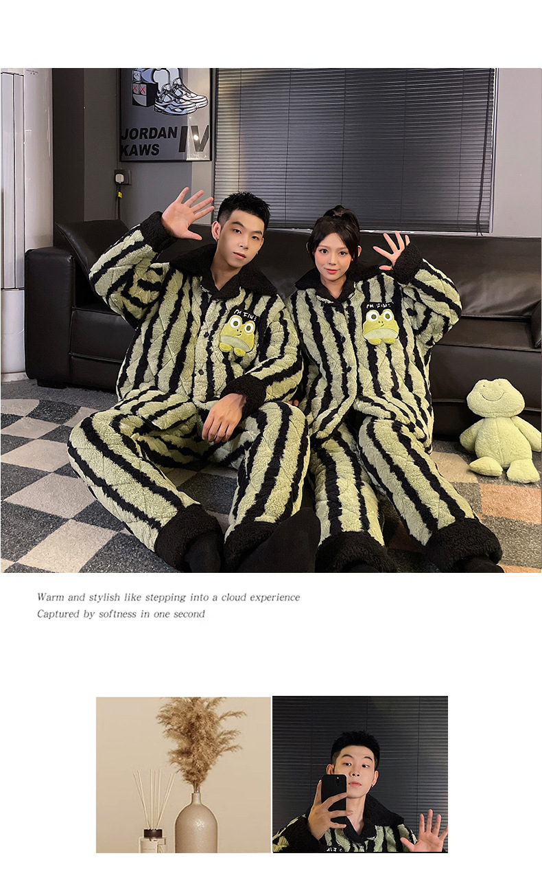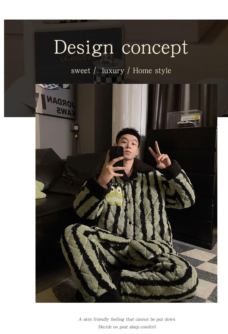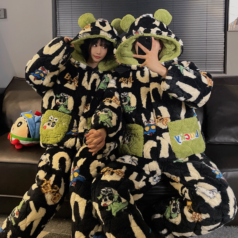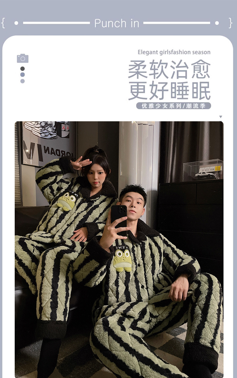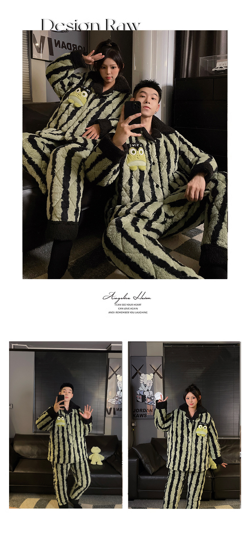 엄선된 3겹 두꺼운 누빔 커플 잠옷 여성용 겨울 신상 만화 카라 가디건 남성용 홈웨어 세트
